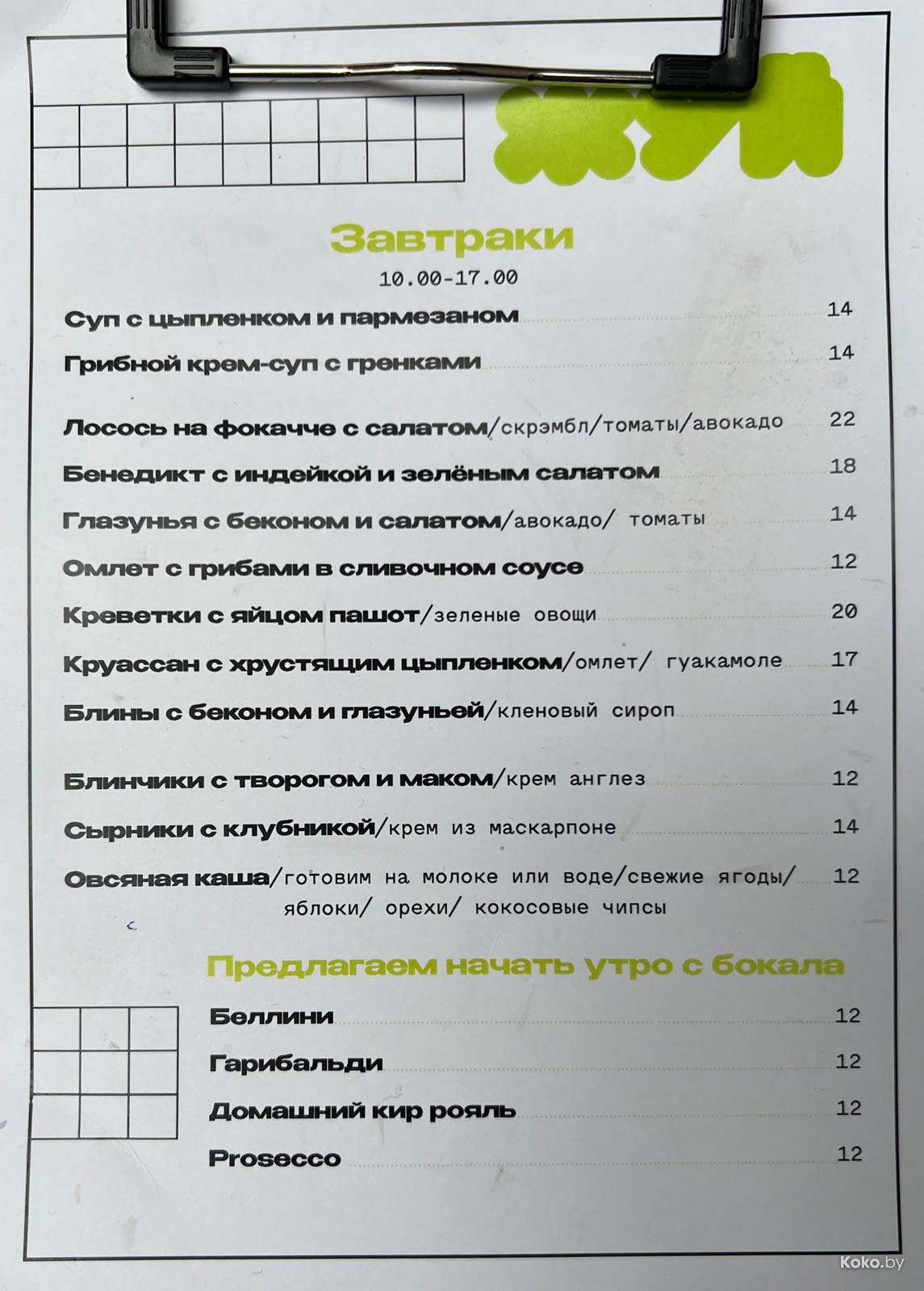 То же самое, как на завтраках «Культуры» и «Флоу», меню с яйцами смешано с основным, хитрый ход, чтобы и завтрак продать и основное показать. Итак, если на машине, то ставим в паркинг за 5byn/час, внутри душновато, через маленькие, как бойница, окна видна дорога. Не сильно уютно, но если будет вкусно, можно стерпеть и не такое.