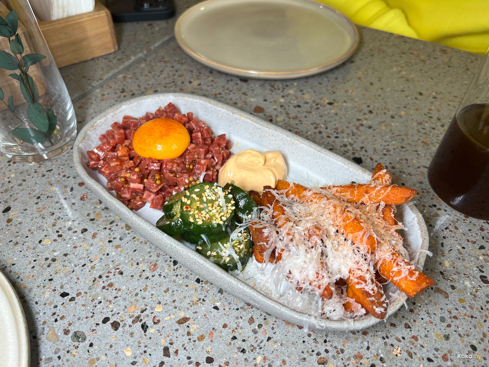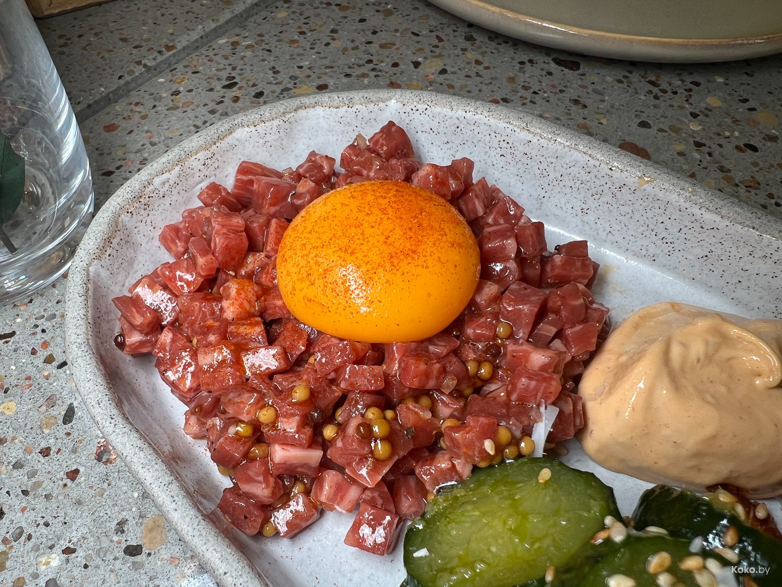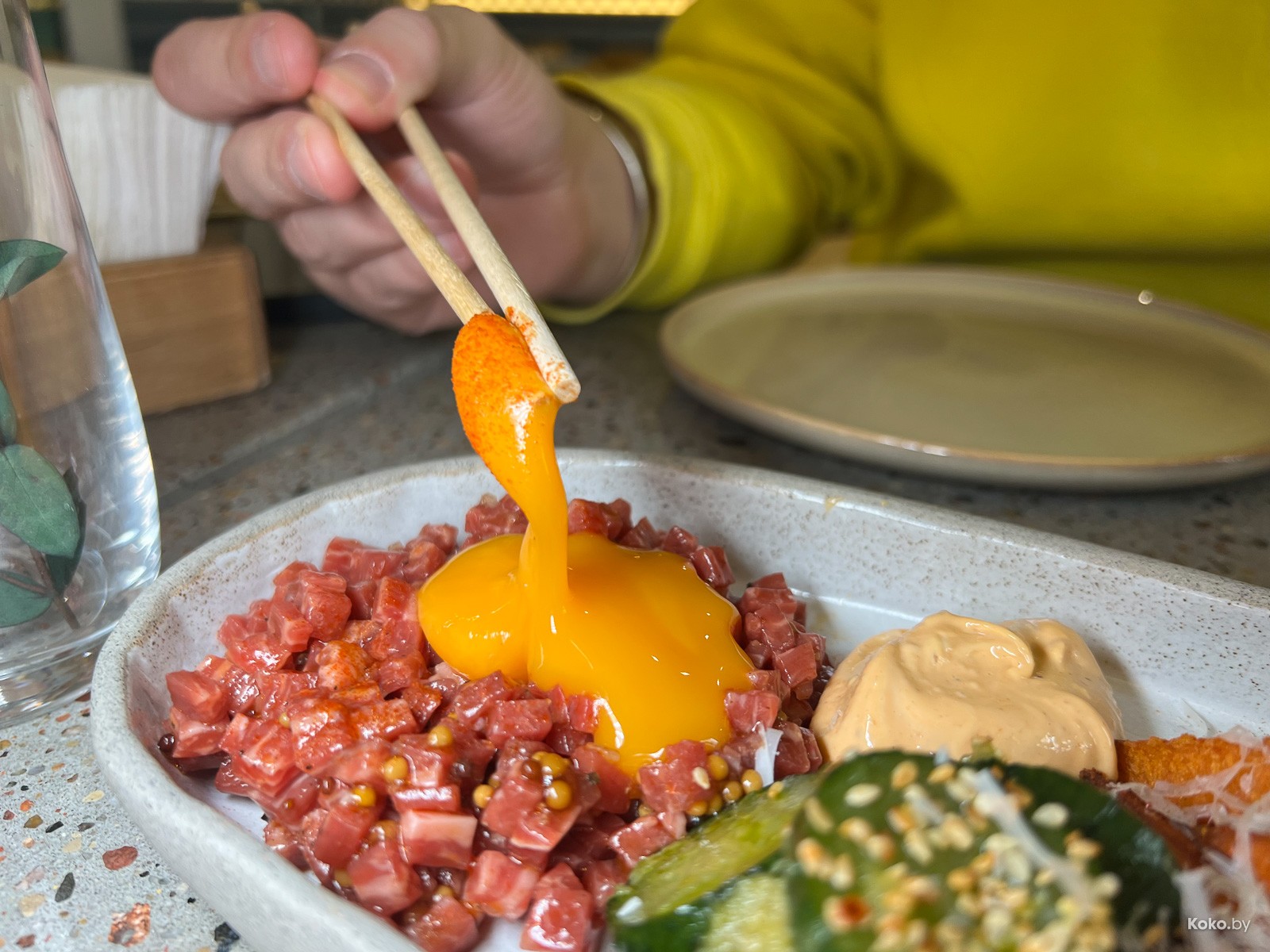 1. Первым с кухни вылупилась кубиками упругих текстур пряная говядина за 19byn с насыщенным маринованным желтком, битым огурцом, сладким бататом фри в сыре и пикантным японским майонезом. Восхитительная комбинация, но для завтрака тяжело.