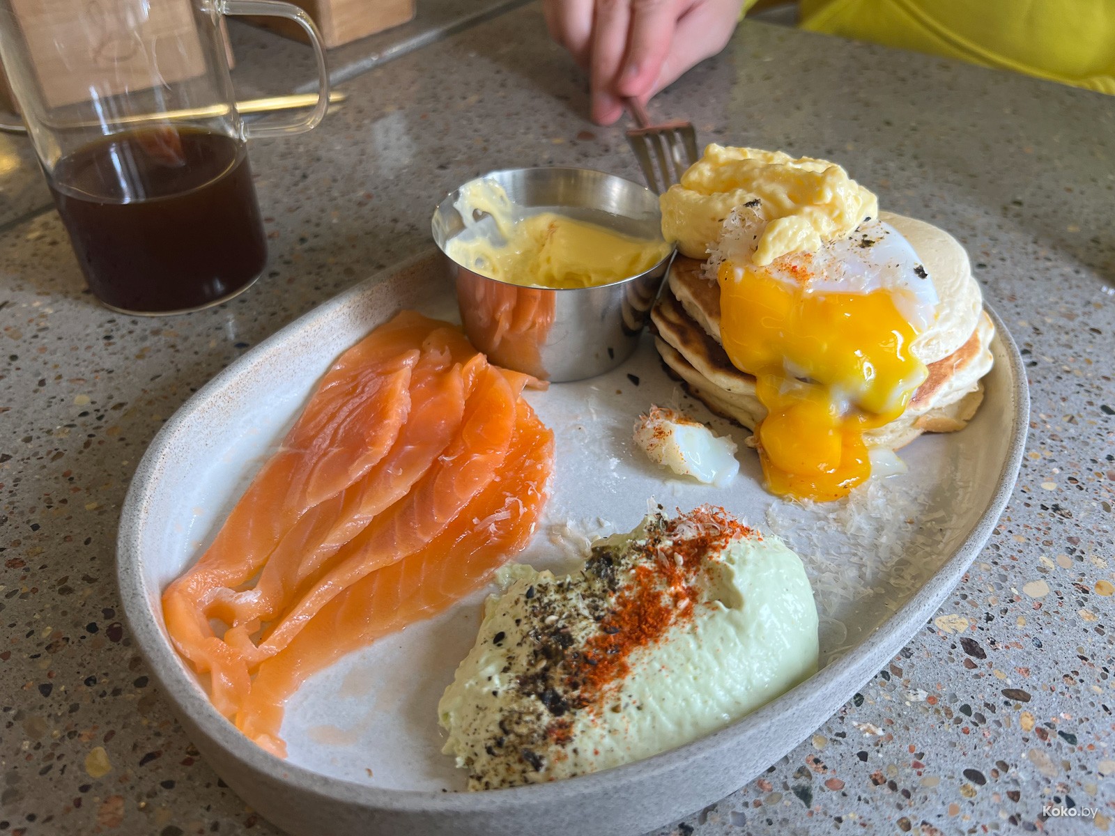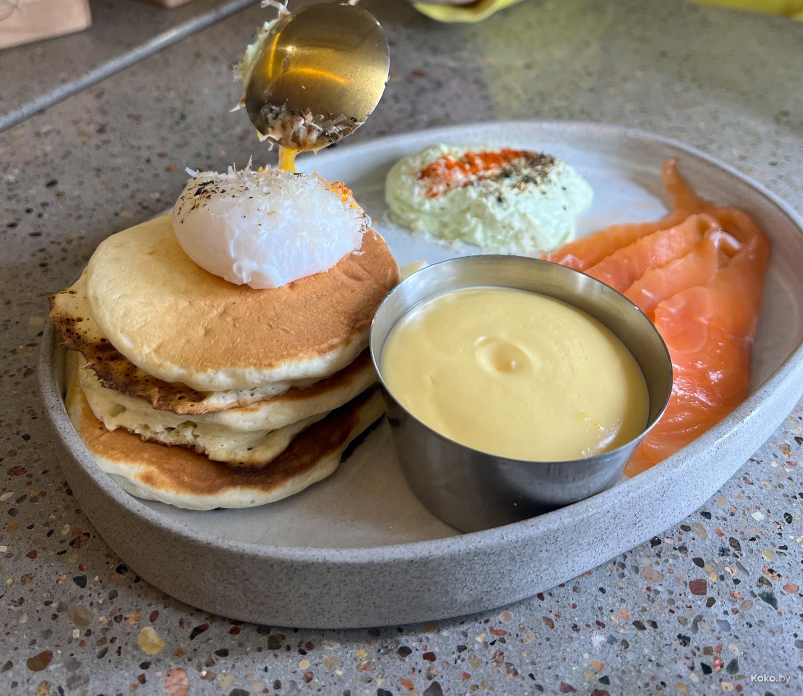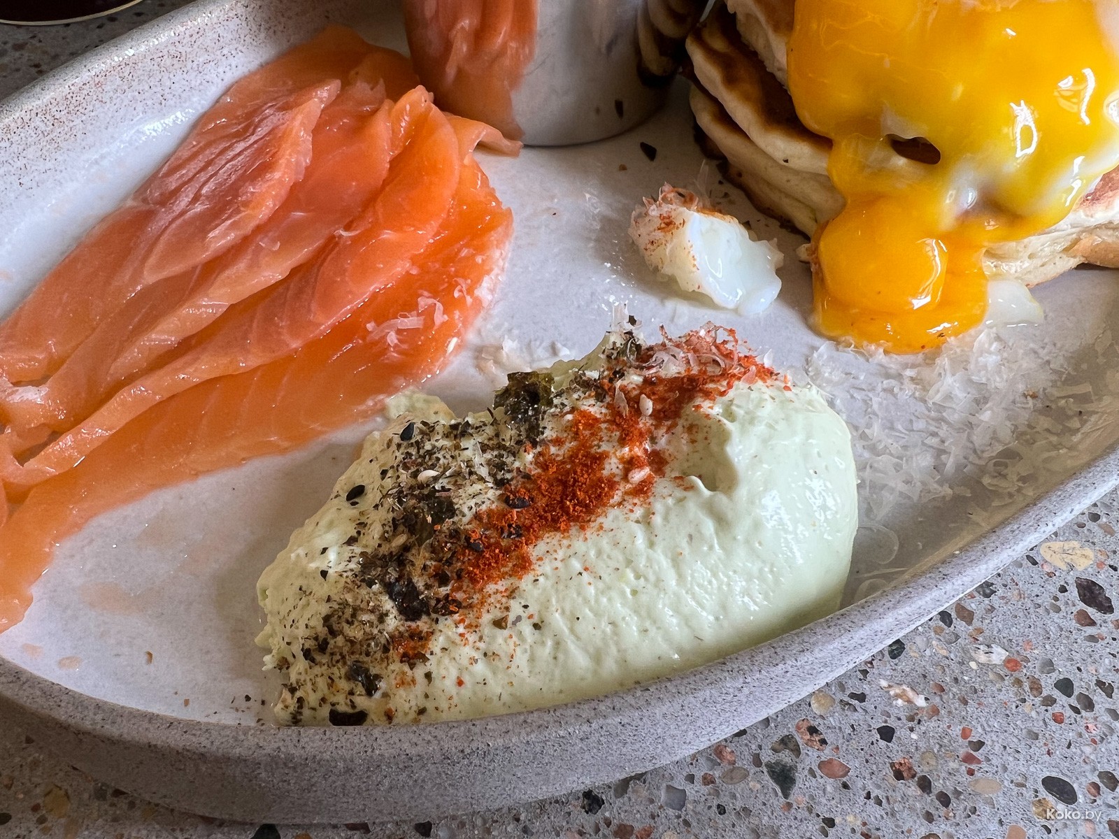 4. Идеальные по тесту мини-панкейки с лососем своего посола, яйцом пашот и двумя бешеными муссами. За 23byn хотелось бы два яйца.