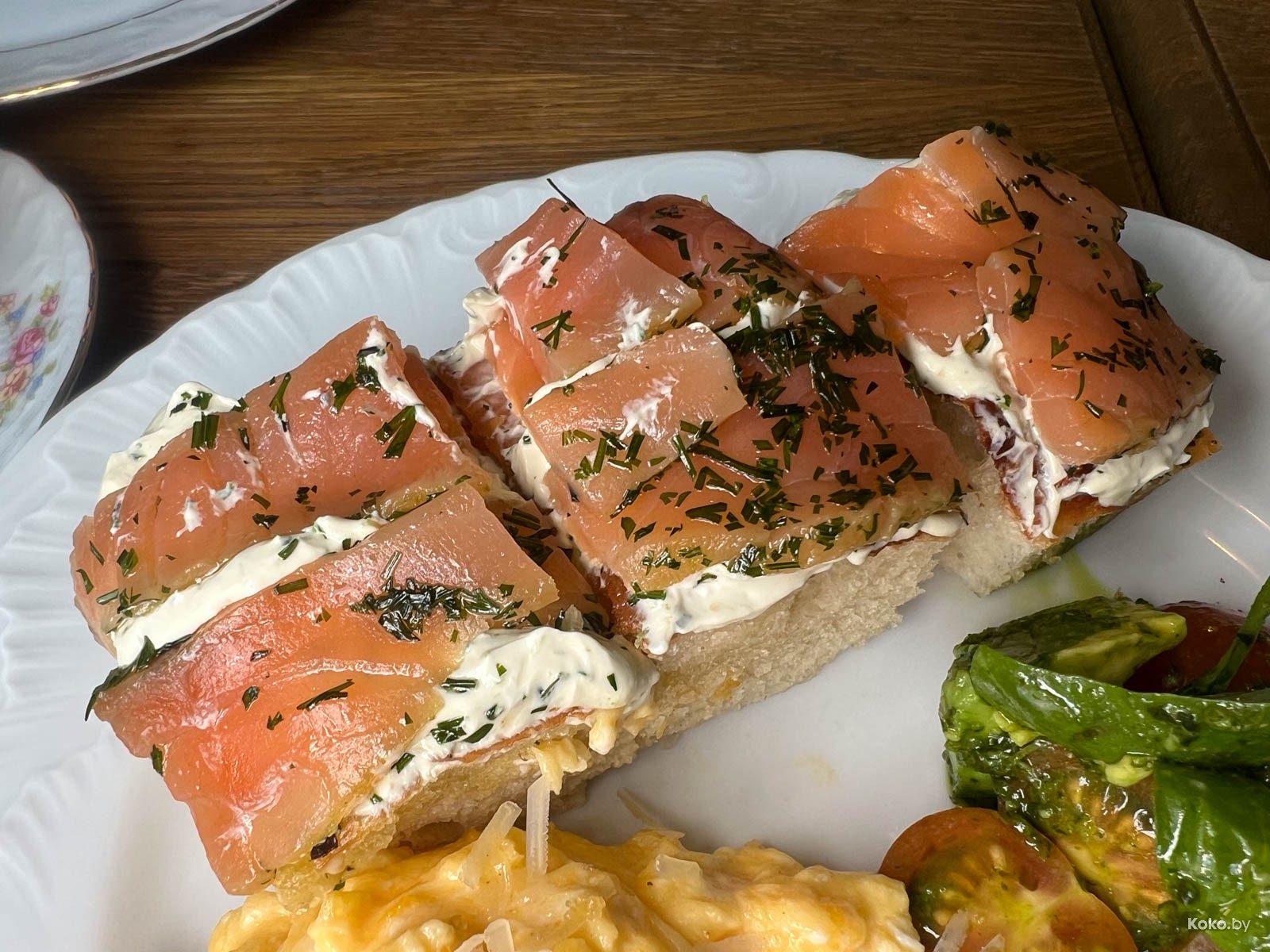 1. Следующий по готовности свой пряный лосось на пышном лаваше, промазанном творожным сыром, с салатом из черри с авокадо в песто и взбитым до омлета яйцом. К качеству продуктов - вопросов ноль, в тарелке за 22byn всё, что нужно на завтрак для растущего организма.