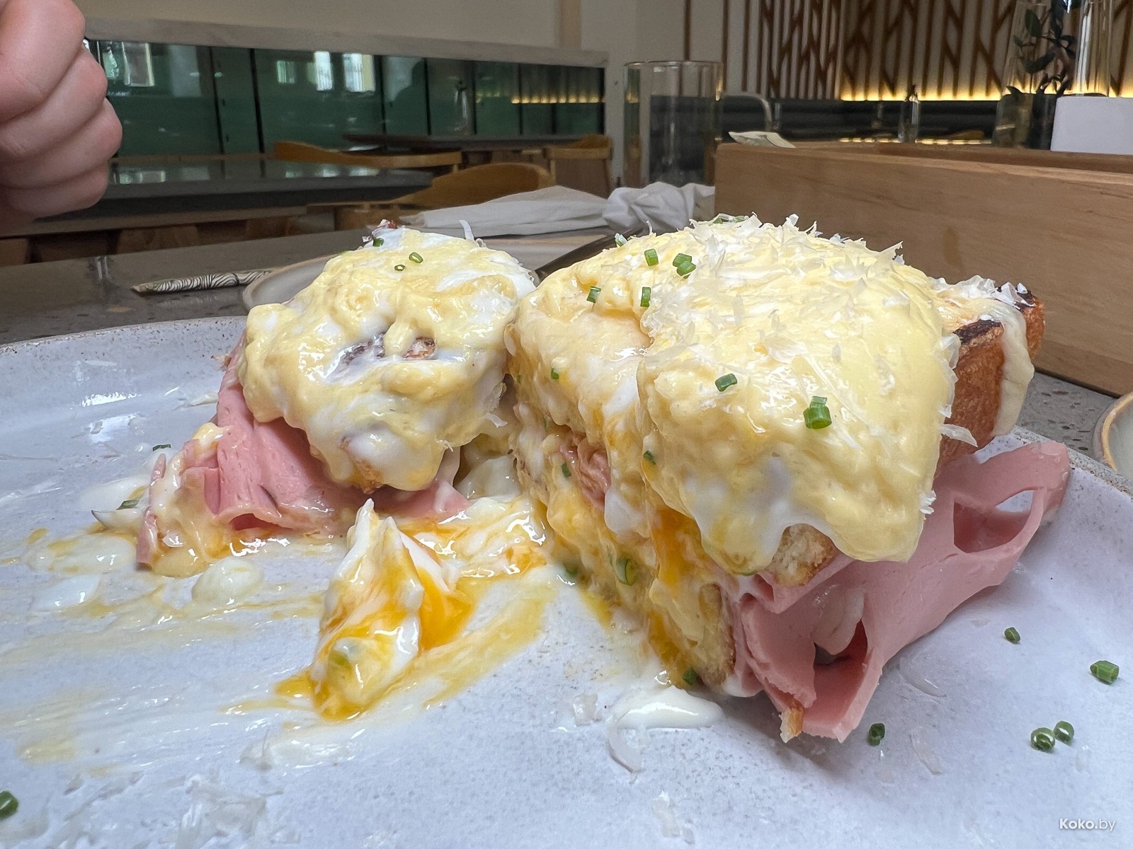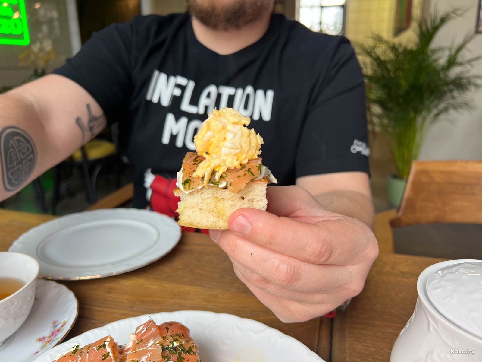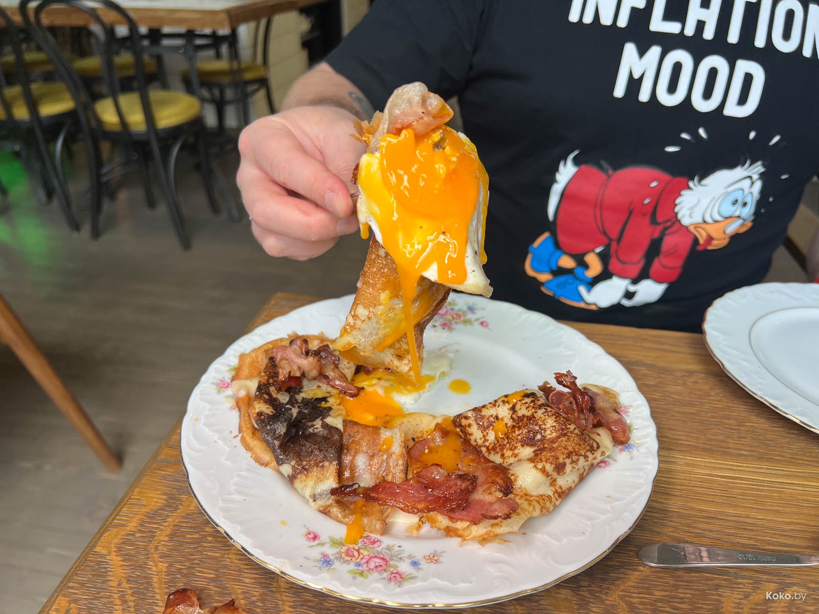 5. Тупо два куска тоста, между которыми белорусская колбаса, а сверху яйцо и опять сырный мусс. За вкусный бутерброд с вас 19byn.