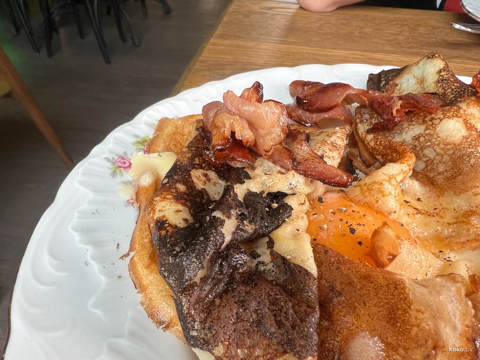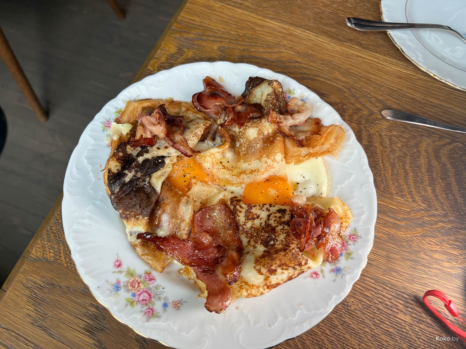 2. Наши тоненькие блинчики на американский манер с глазуньей из двух яиц белорусской птицы, жаренным до чипсов беконом в кленовом сиропе. Один из блинов угорел, а так интересно, с вас 14byn.