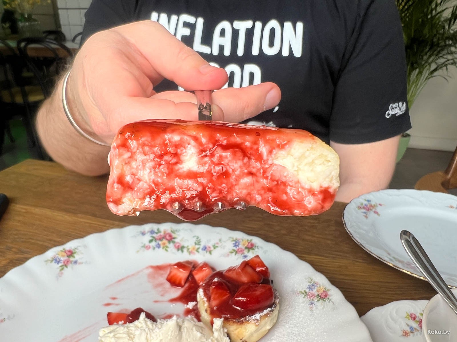 4. На большой тарелке за 14byn три сырника в клубничном варенье быстрой варки. Текстурные, воздушные, чуть не заплакал.