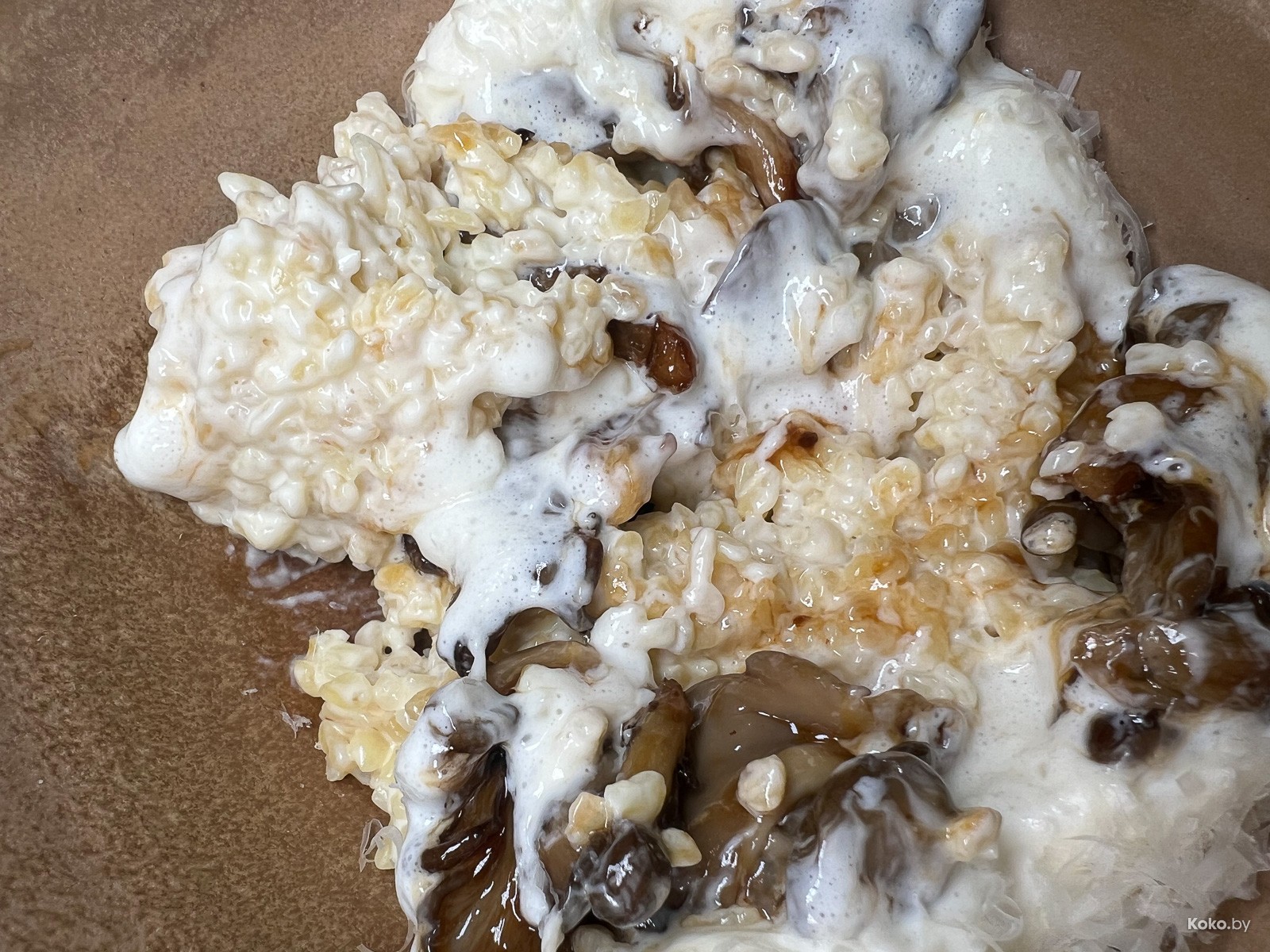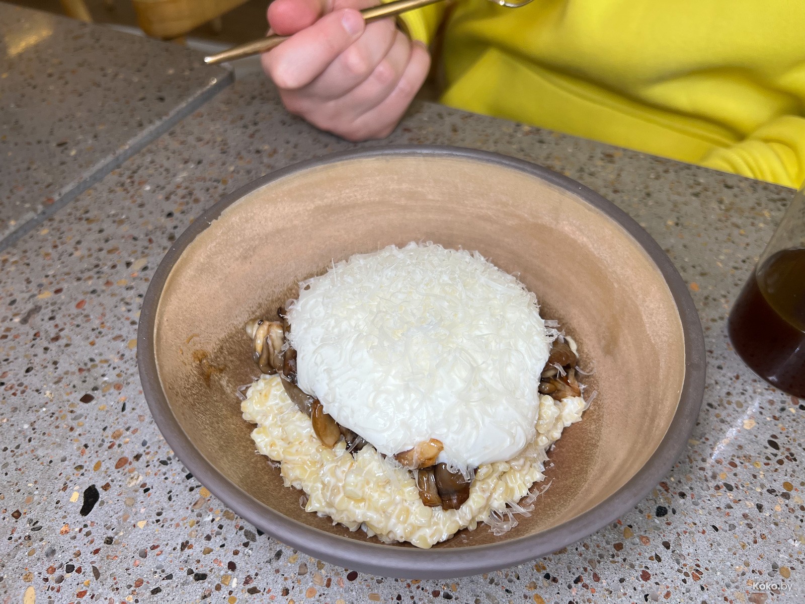 3. Честная порция булгура с японскими грибами в соусе под шапкой из сырного мусса. В то утро это было лучшее вложение 16byn в кашу.