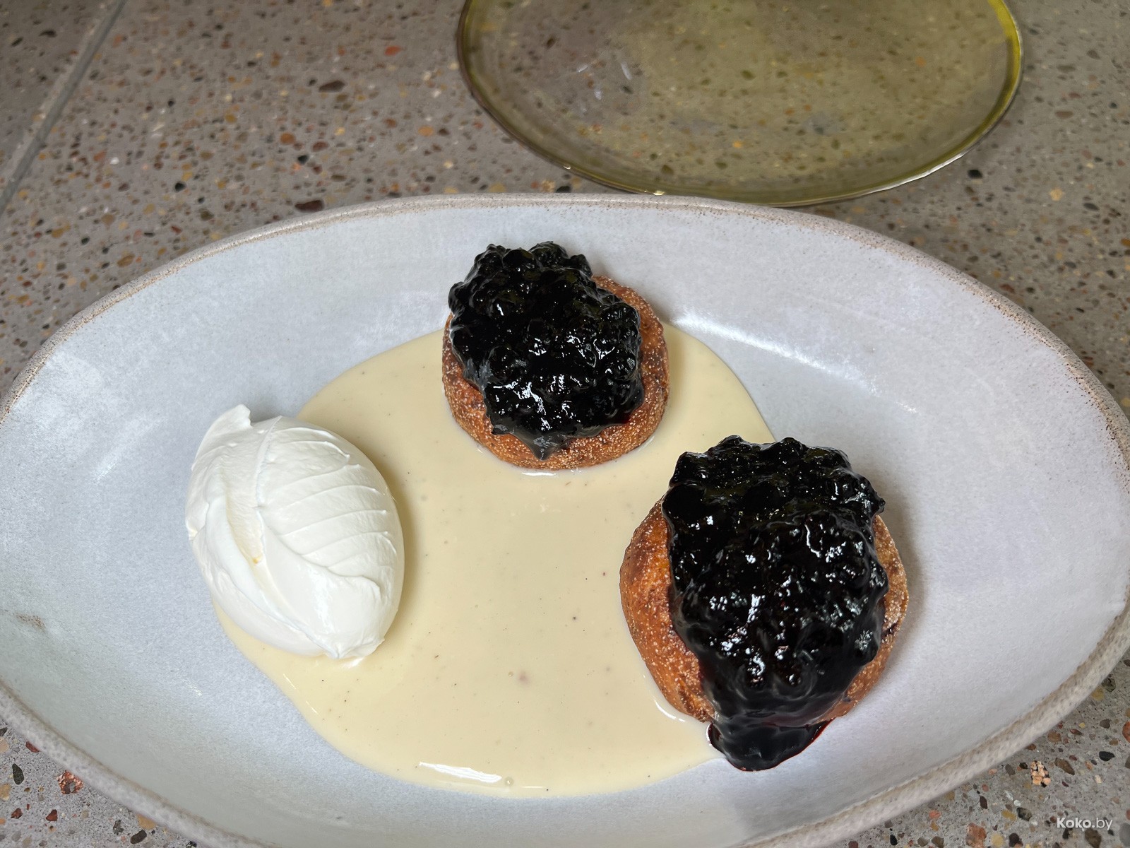 6. На десерт два кремообразных сырника, запечатанных хрустящей корочкой, в луже ванильного крема и с черничным вареньем. Они не такие гиганты, чтобы за 14byn их была пара, минимум три! Пока что лучшие сырники за 15byn жарят в бизнес-кафе «Блум».