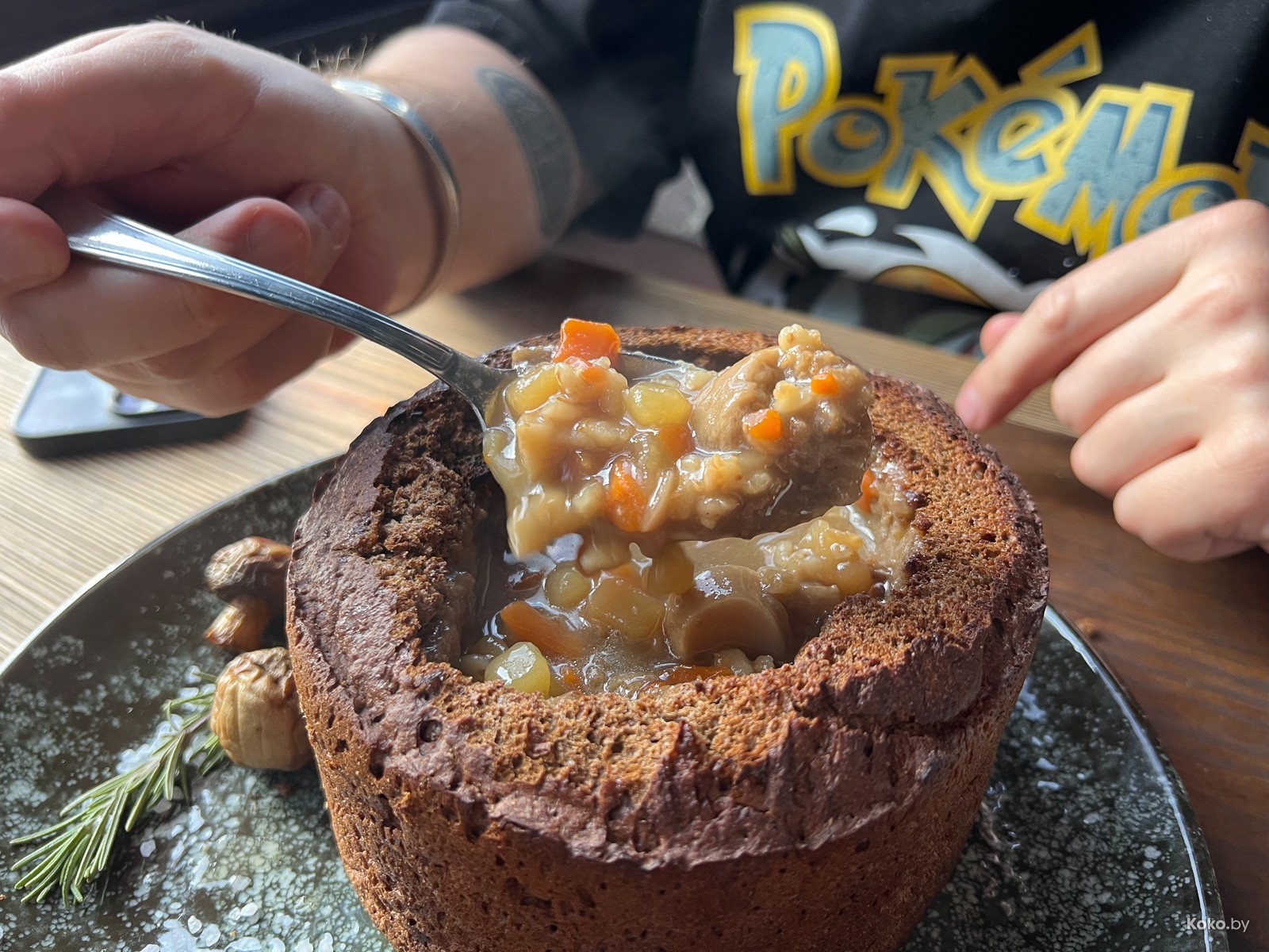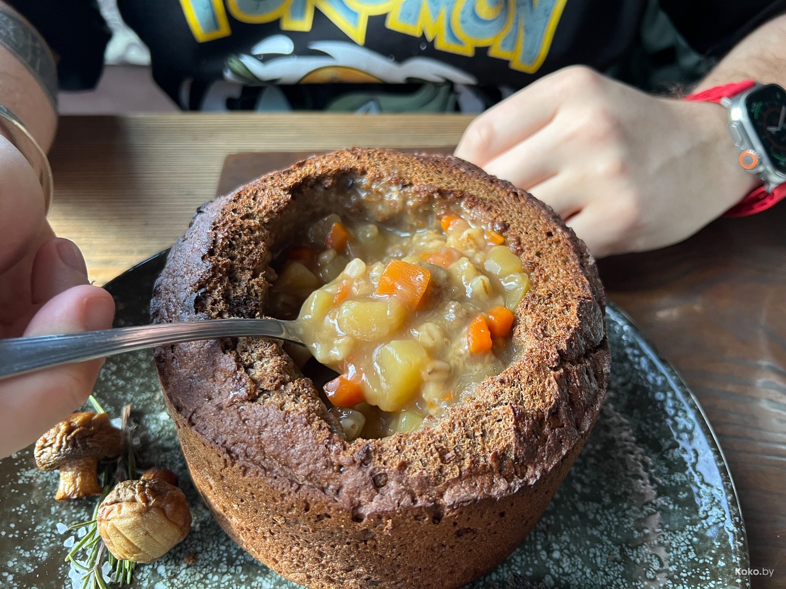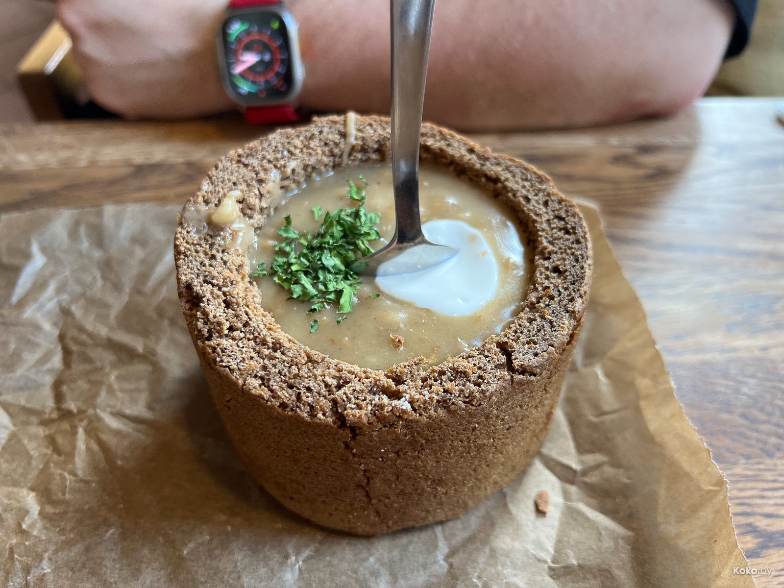 Неимоверно вкусно макать поджаренную хрустящую горбушку хлеба в душистый грибной суп на сливках. Поэтому пришло в голову собрать особенную подборку: сегодня пройдёмся по супам в хлебных тарелках от 9 до 18byn, к слову, ни разу не получалось съесть блюдо целиком. Почему? - спросите вы. Сейчас покажу на себе. Предупреждаю, если решитесь повторить мой квест, то лучше набрать в заведение с уточнением наличия супа в хлебе, с готовым хлебом часто беда.
