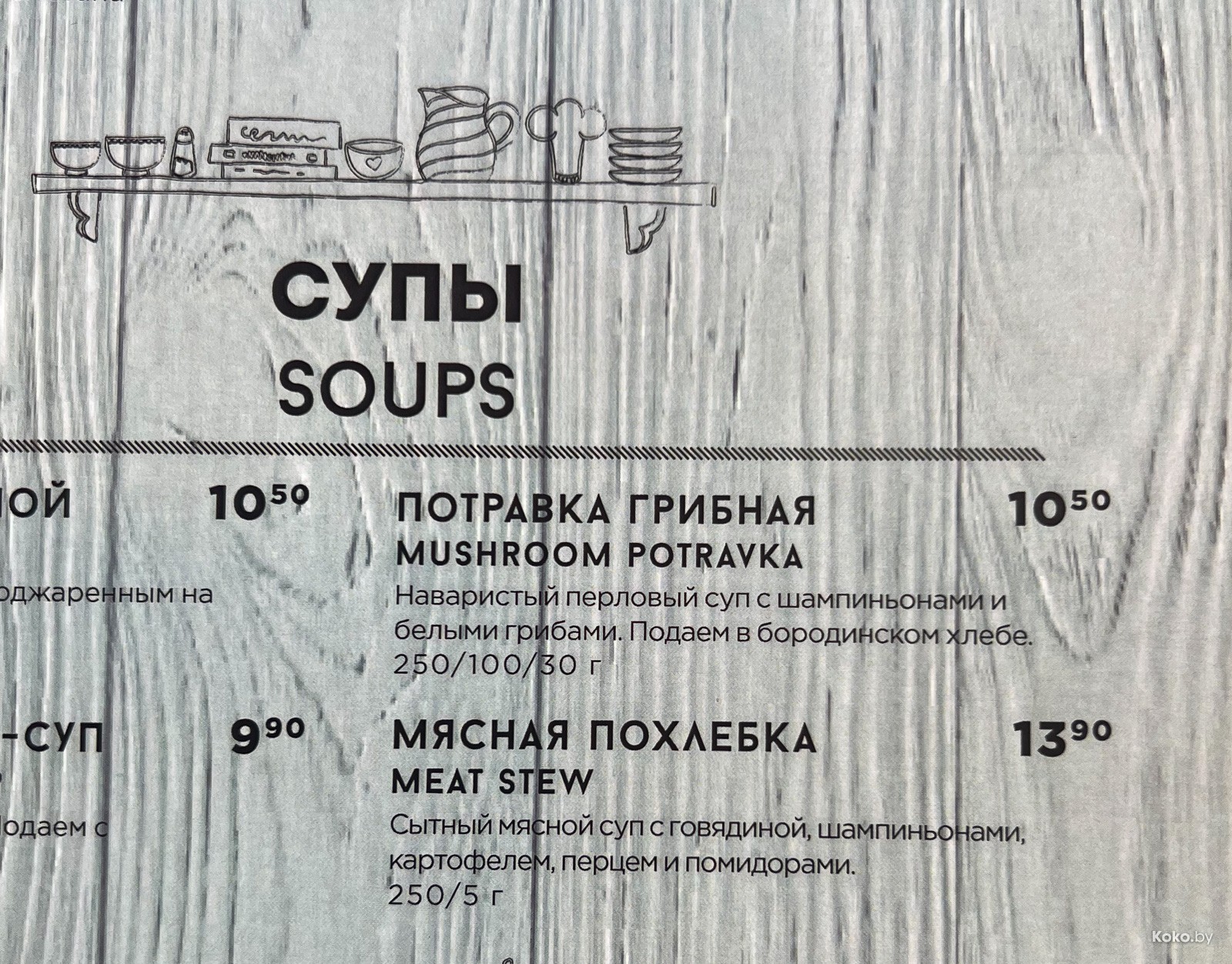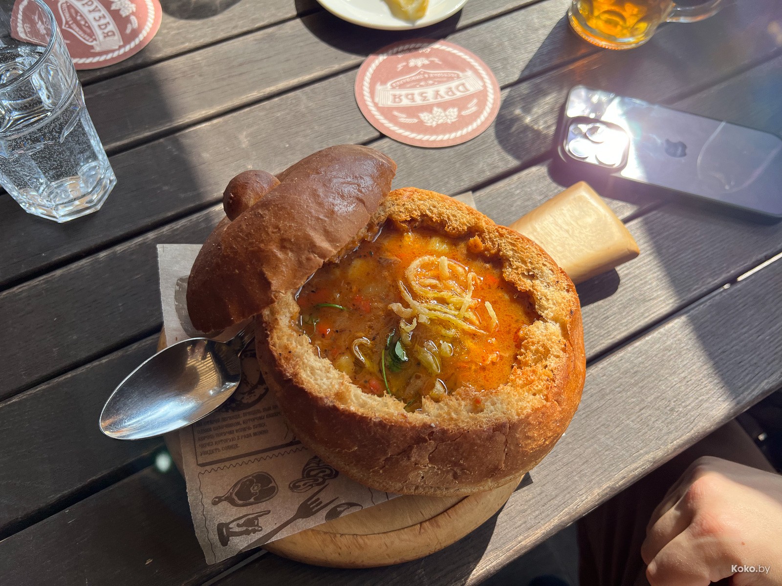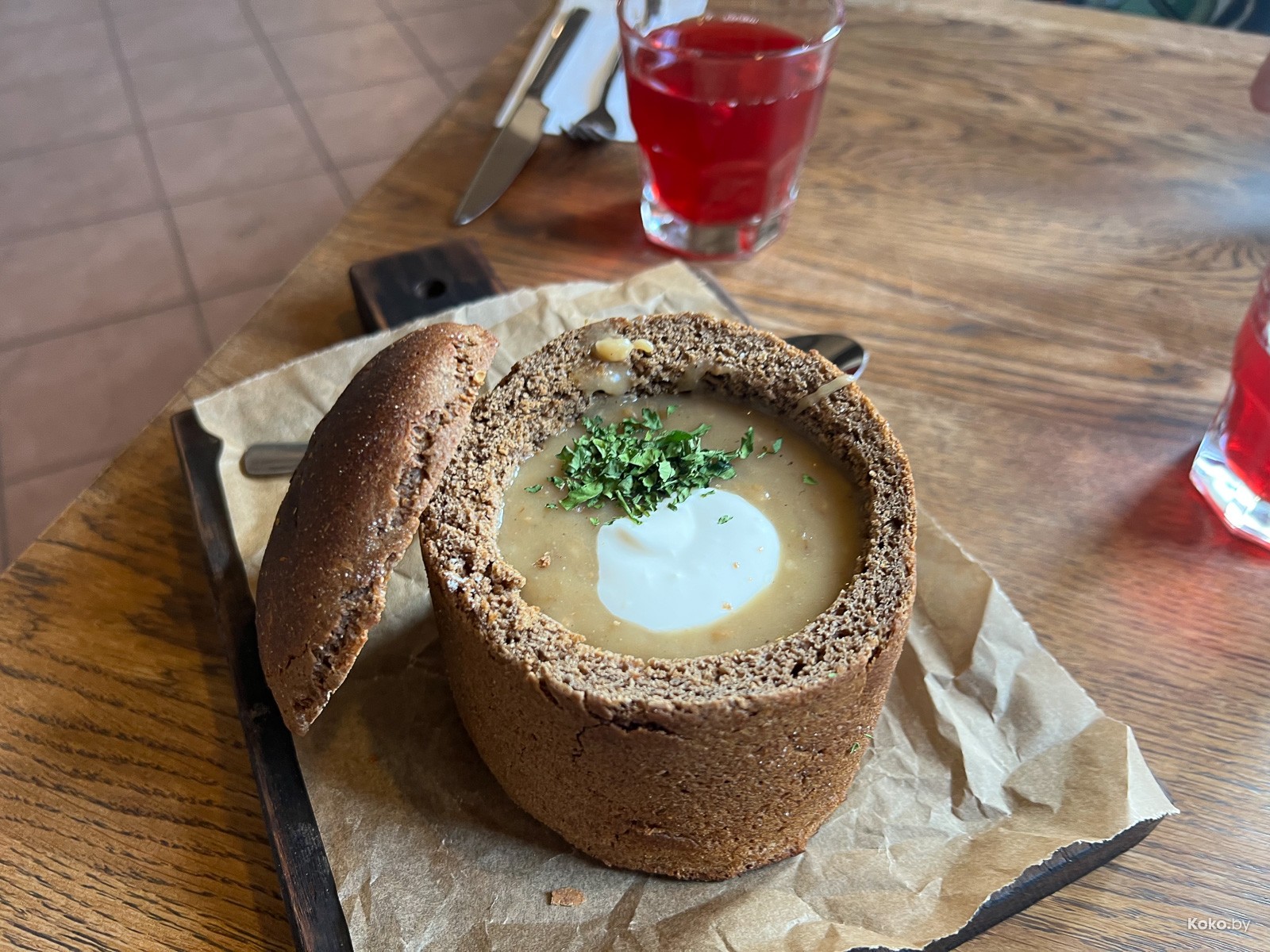Неимоверно вкусно макать поджаренную хрустящую горбушку хлеба в душистый грибной суп на сливках. Поэтому пришло в голову собрать особенную подборку: сегодня пройдёмся по супам в хлебных тарелках от 9 до 18byn, к слову, ни разу не получалось съесть блюдо целиком. Почему? - спросите вы. Сейчас покажу на себе. Предупреждаю, если решитесь повторить мой квест, то лучше набрать в заведение с уточнением наличия супа в хлебе, с готовым хлебом часто беда.