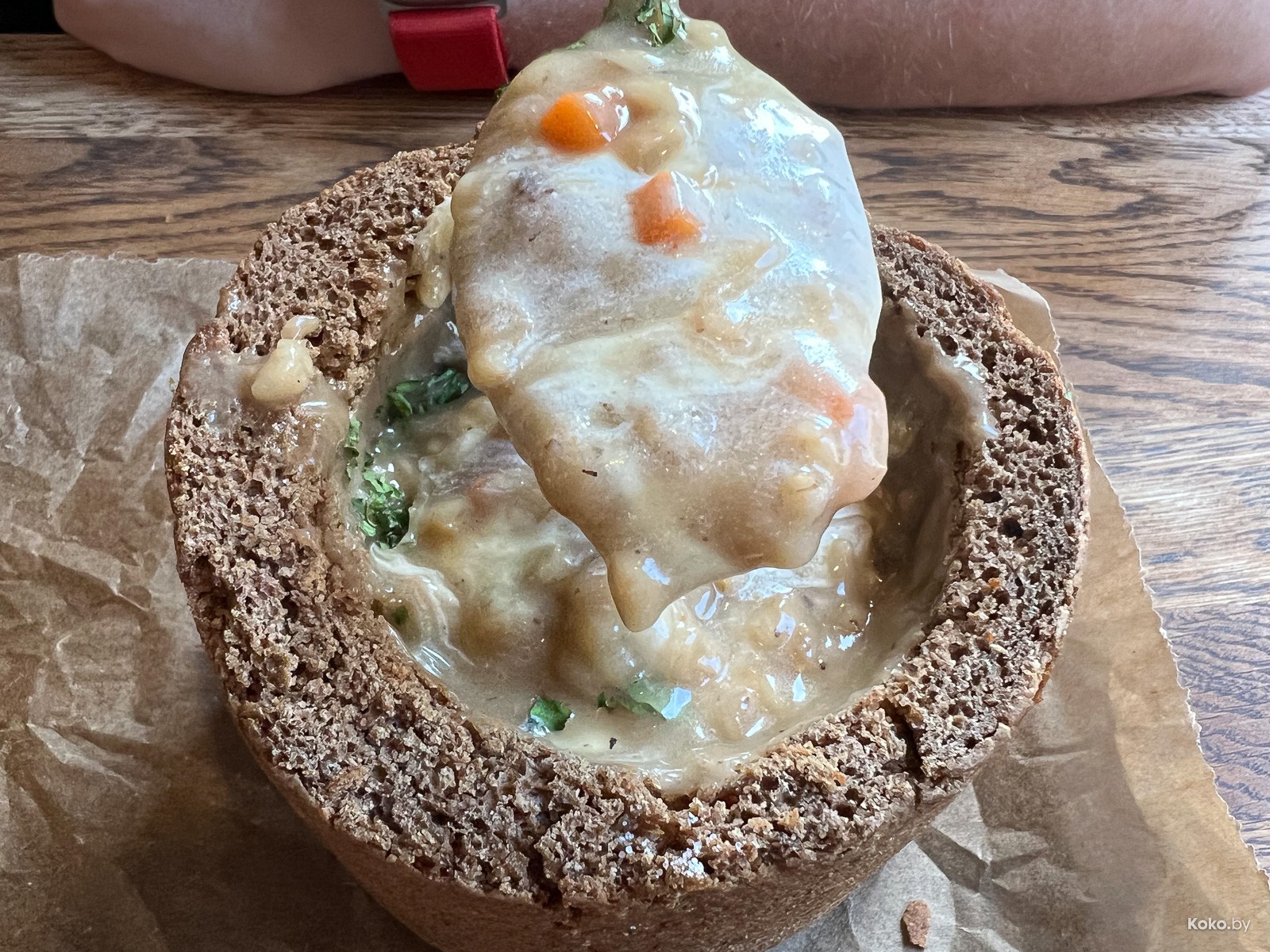 Вкус здешней сливочной похлёбки помню со времён «продай с молотка недвижимость» на Комсомольской в маленьком уютном офисе. В те славные, но далёкие времена, суп подавали в круглой буханке хлеба.