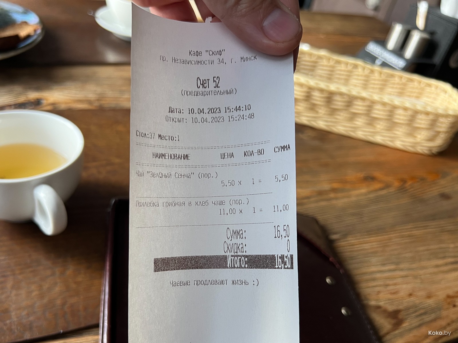 Как и тогда, готовят его из-под ножа минут тридцать. Вот это поворот, тот самый вкус, только в румяном кирпичике, скорей всего магазинном. Порция большая, суп сливочный, слегка сладкий, с морковкой, луком и шампиньонами. При справедливой цене в 9byn - это 9 кокобаев!