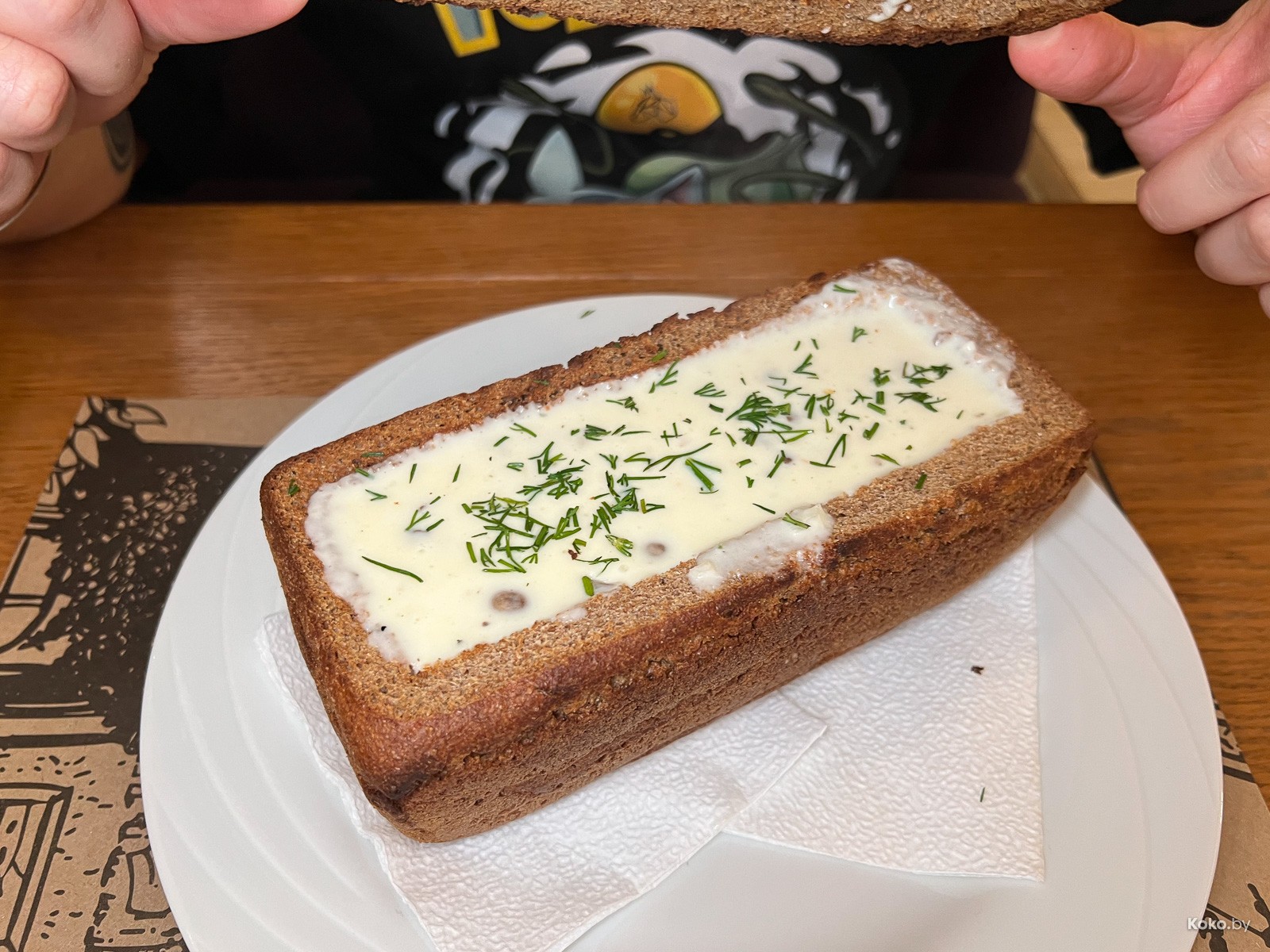 Тут у них в белом хлебе дичь, а точнее наваристая гуляшовка из оленя за 18byn. Внутри самоиспечённого хлеба честная порция густой томатной похлёбки с мясом, горячо, поэтому обязательно дуйте на ложку, как деды учили. Восхитительное яство, минимум на 8 кокобаев!