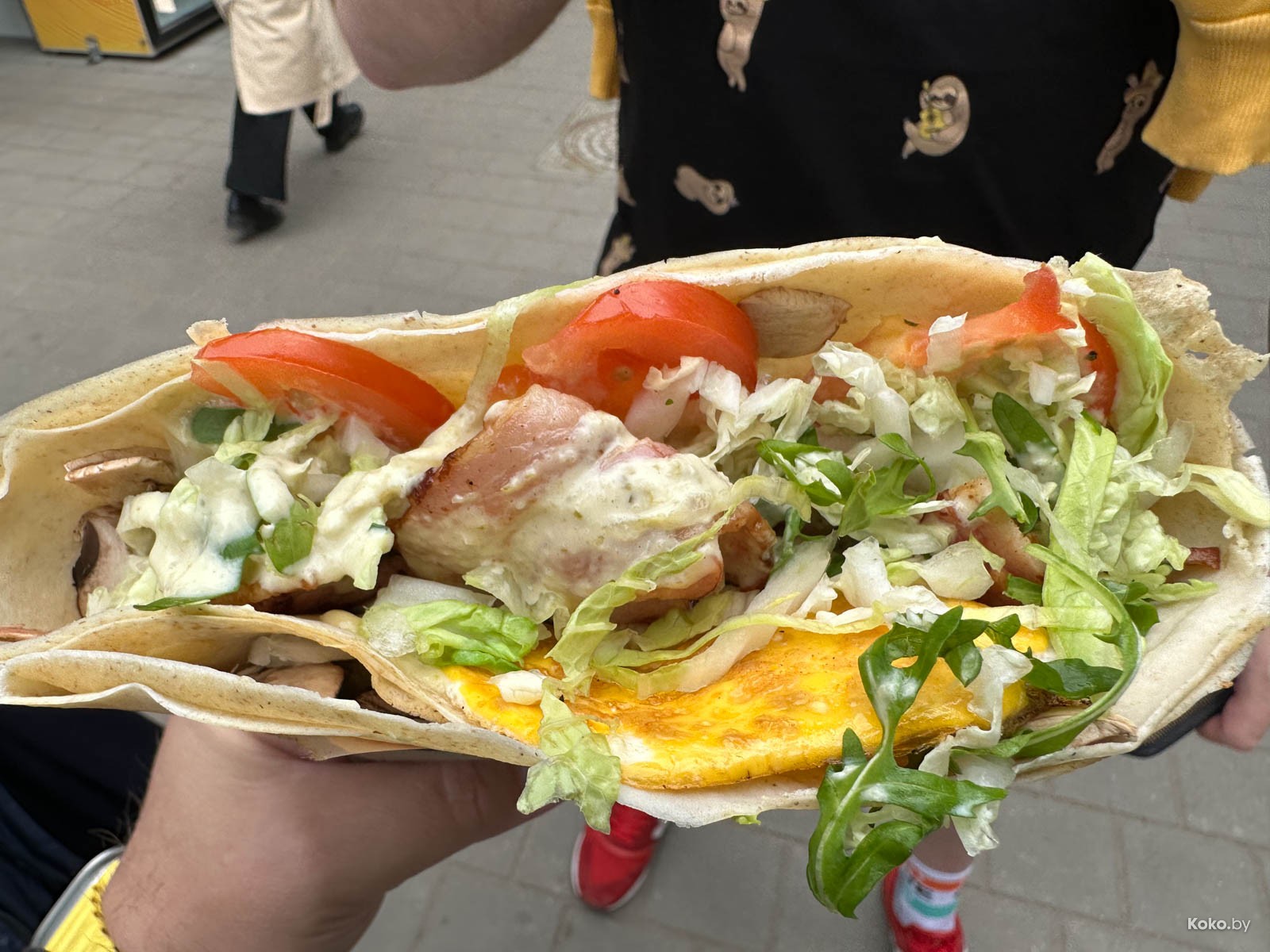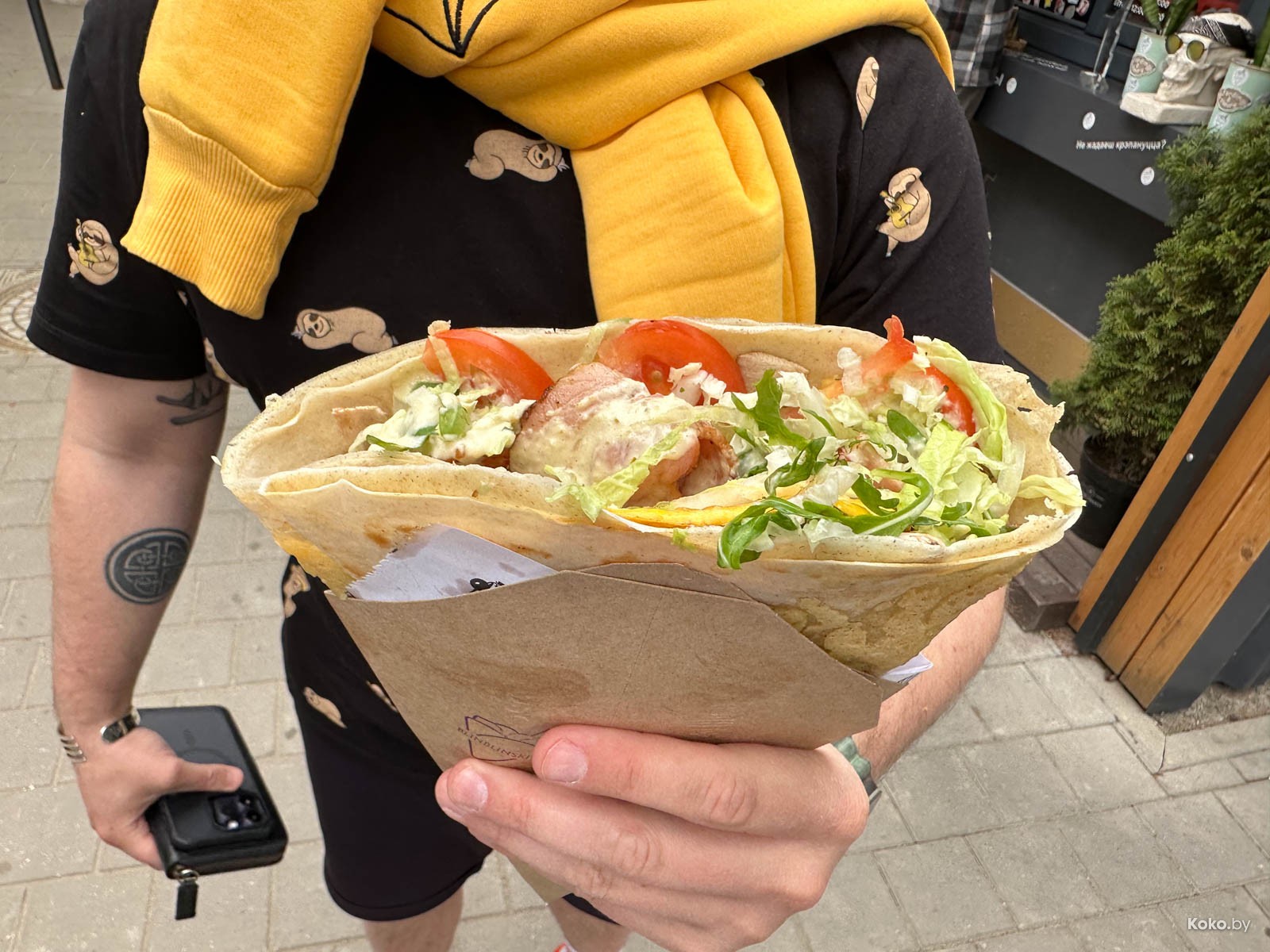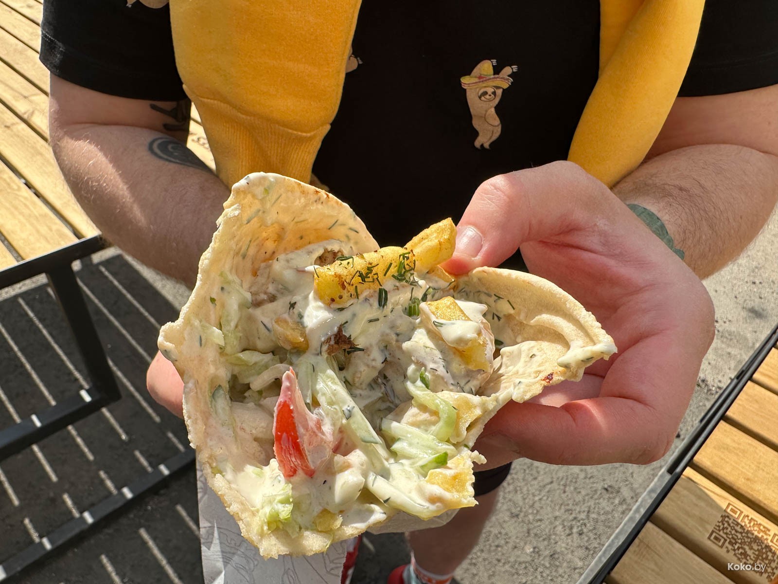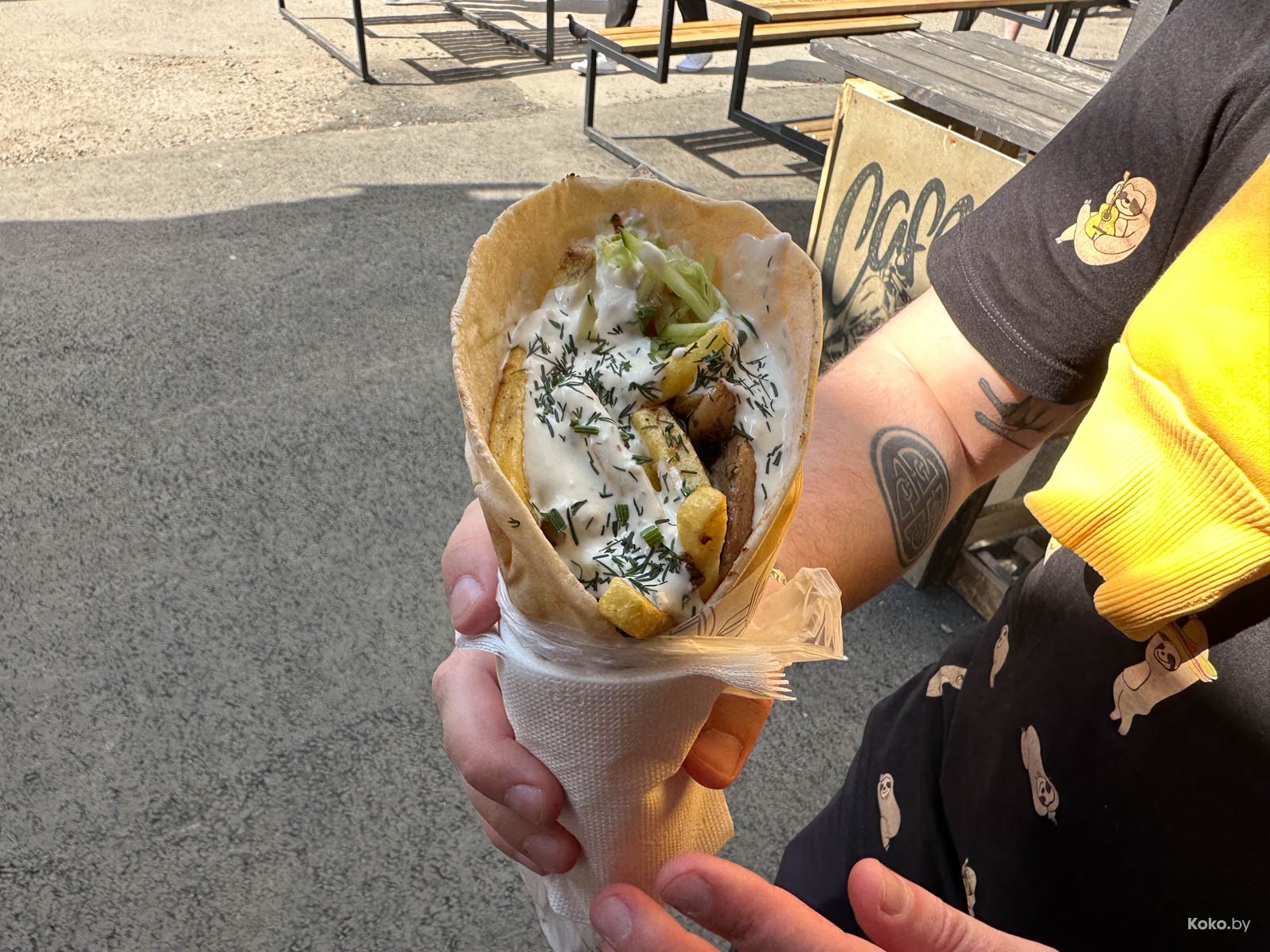 2. Внезапно хорошо исполнили греческий гирос на своей лепёшке с немного курицы, картошкой и овощами под йогуртовым соусом дзадзики. Просят 10byn, как любая шаурма за пределами песочницы.