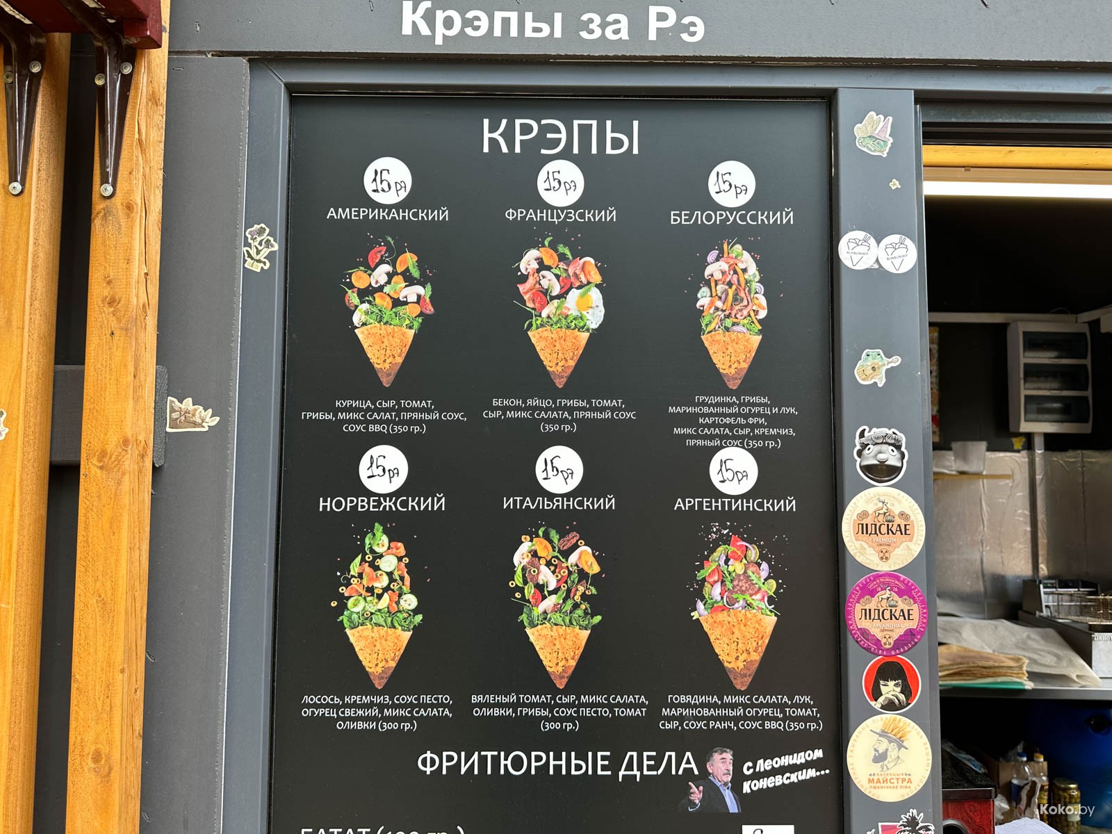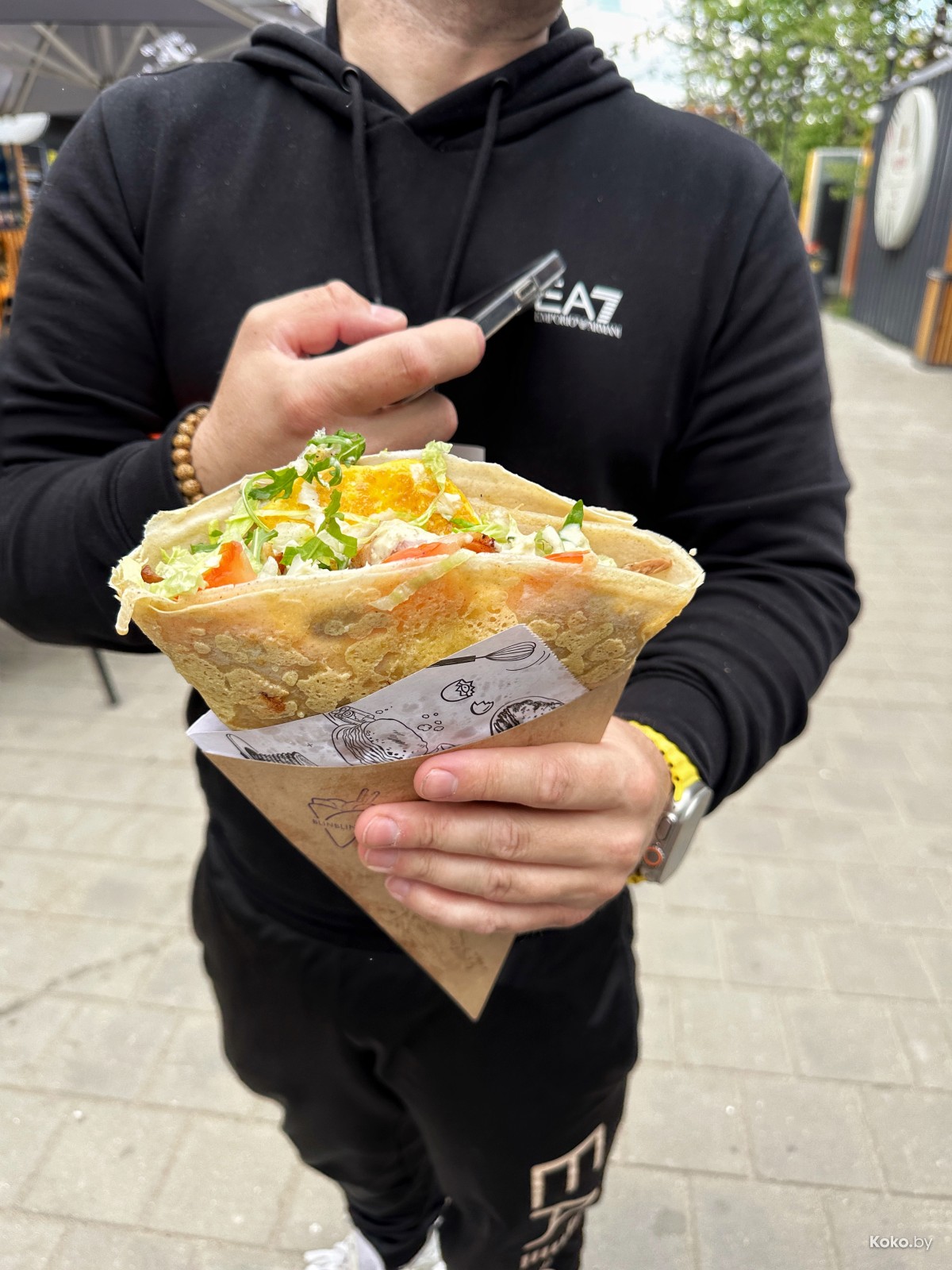 По-французски, но не поцелуй, блинец за 15byn. В пышном, слегка хрустящем блине кладезь сытной начинки, овощи, жареное яйцо, бекон и стакан соуса, будьте аккуратны, следите за его попкой, может потечь.