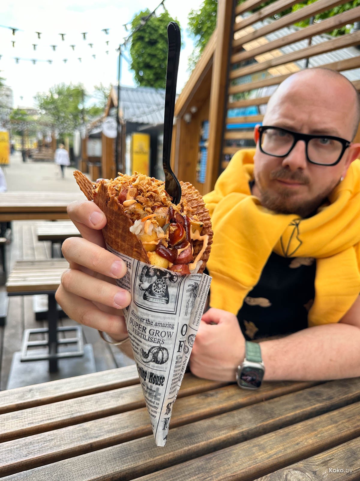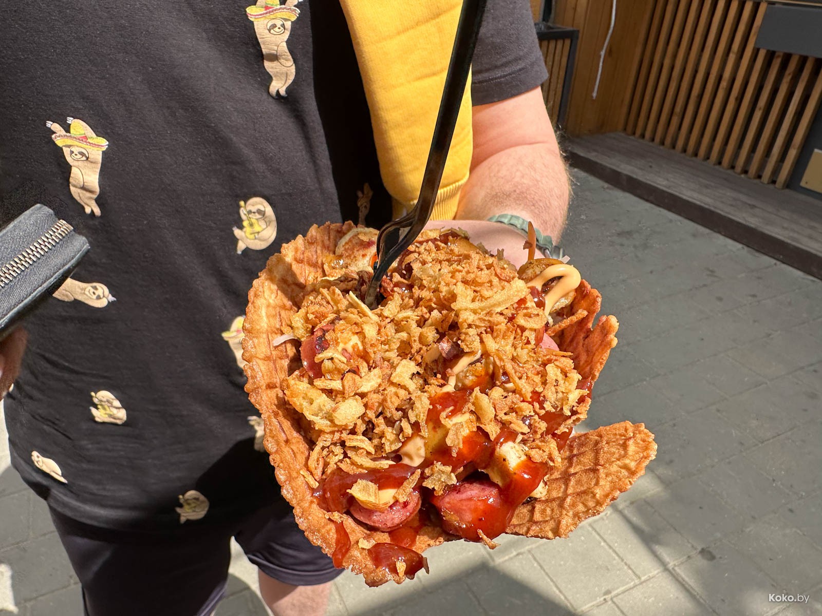 1. Сразу советую вафлю с порубленными колбасками, воздушными картофельными шариками и капустой из «Уникорна». Сытно, вкусно, из-за обилия соусов невозможно остановиться, просят за неё 15byn.