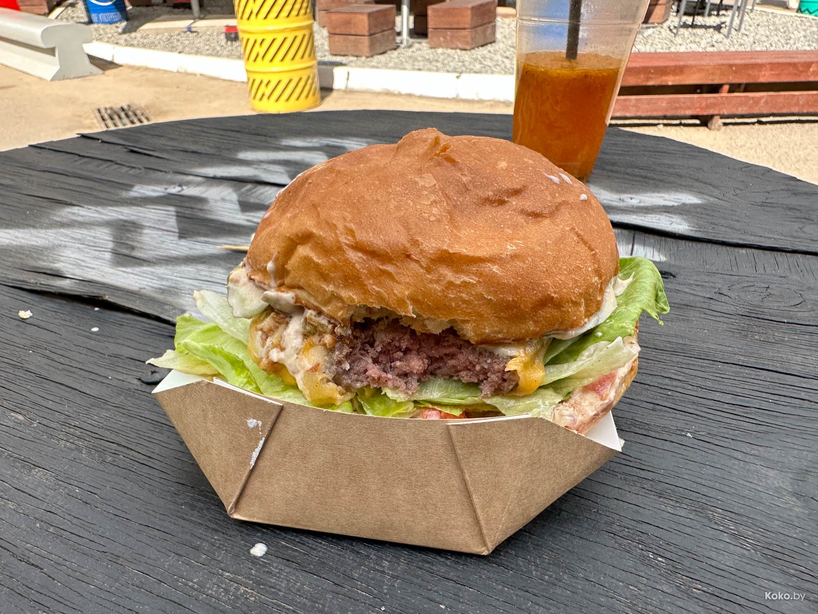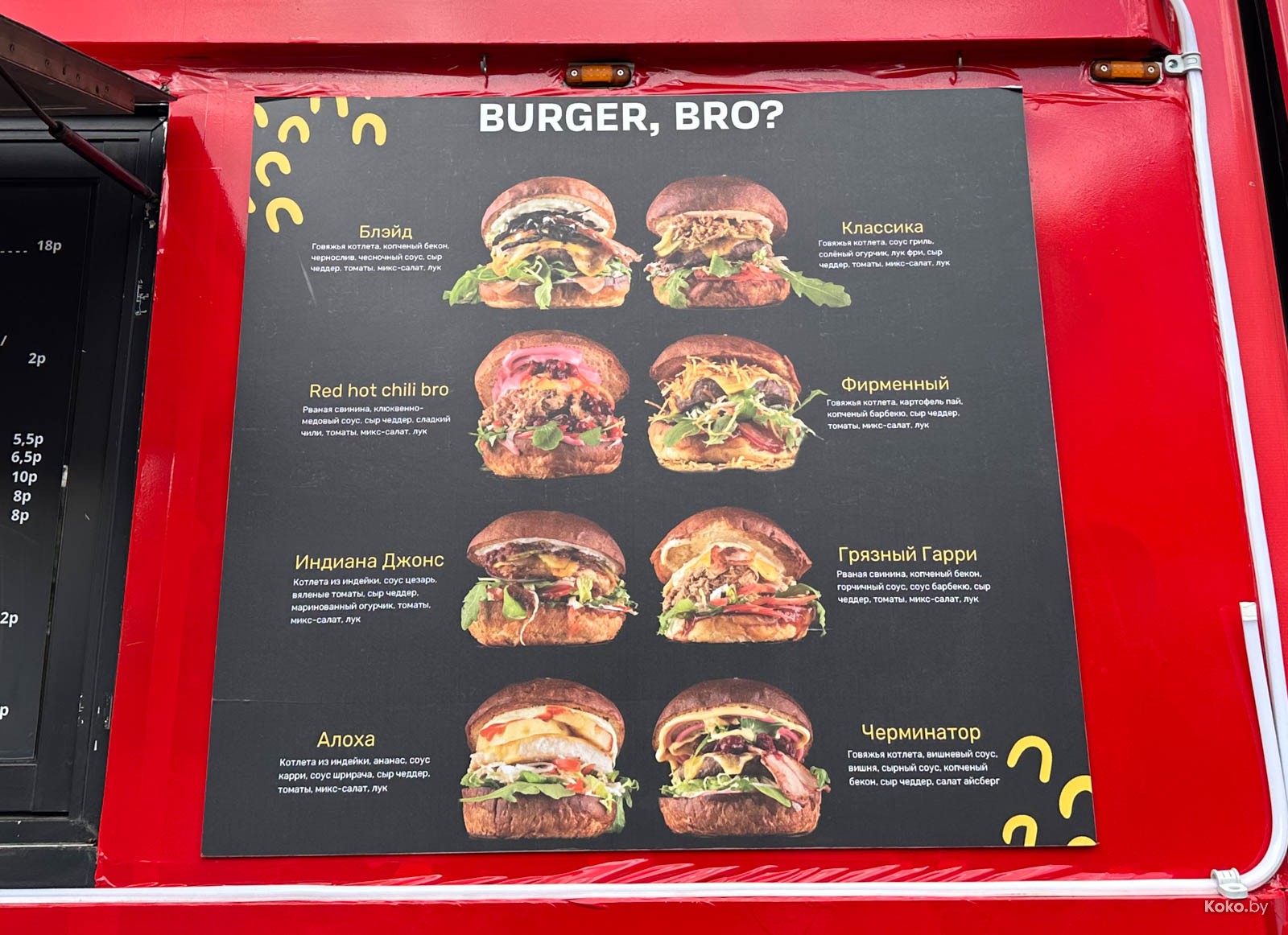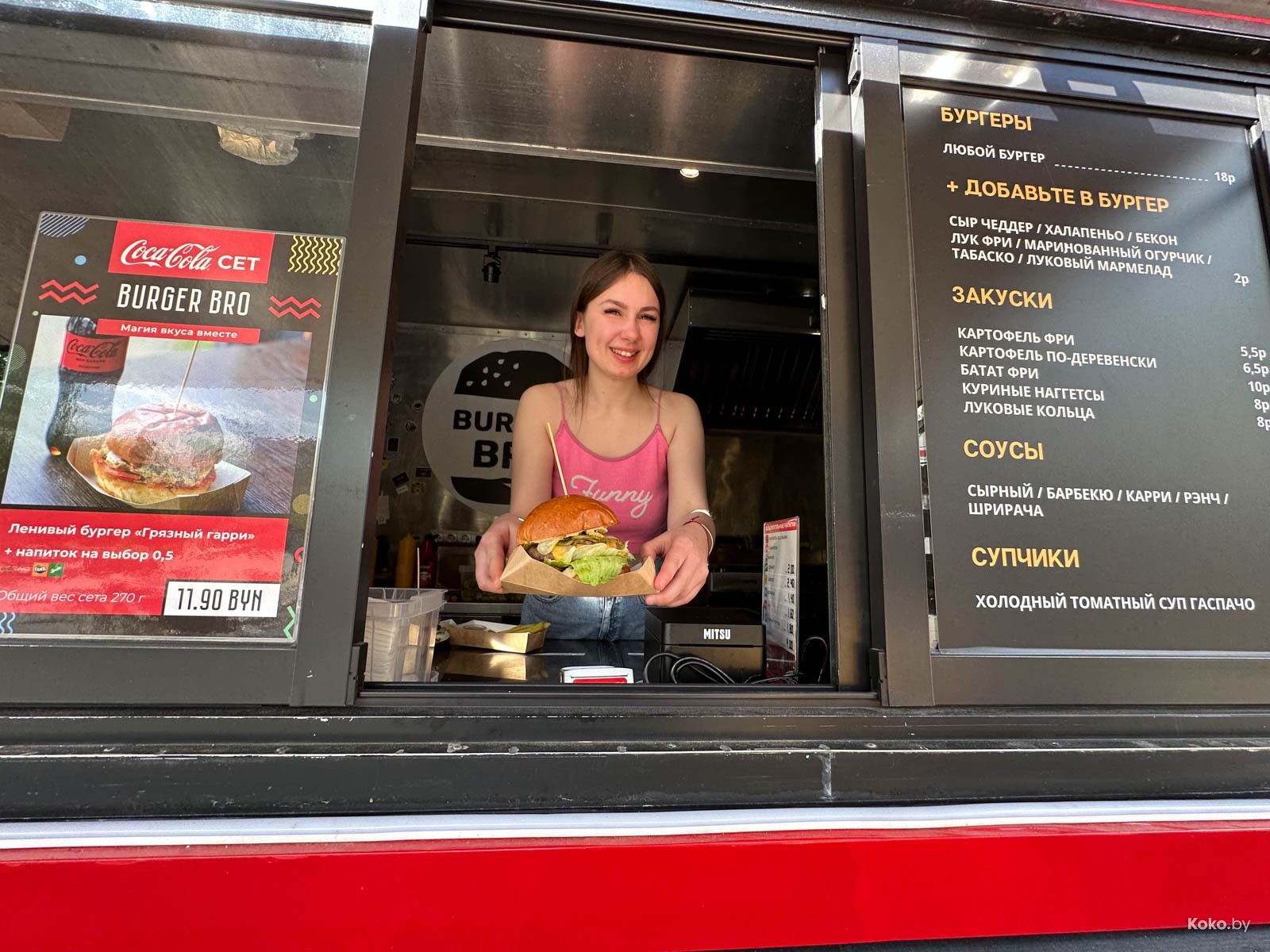 3. С колёс «Бургер Бро» вынес классический бургер за шок для уличной еды - 18byn. И был он, как справедливый бургер: большой, сочный, с мясистой котлетой, с сыром и овощами под пышной булкой. Падабайка!
