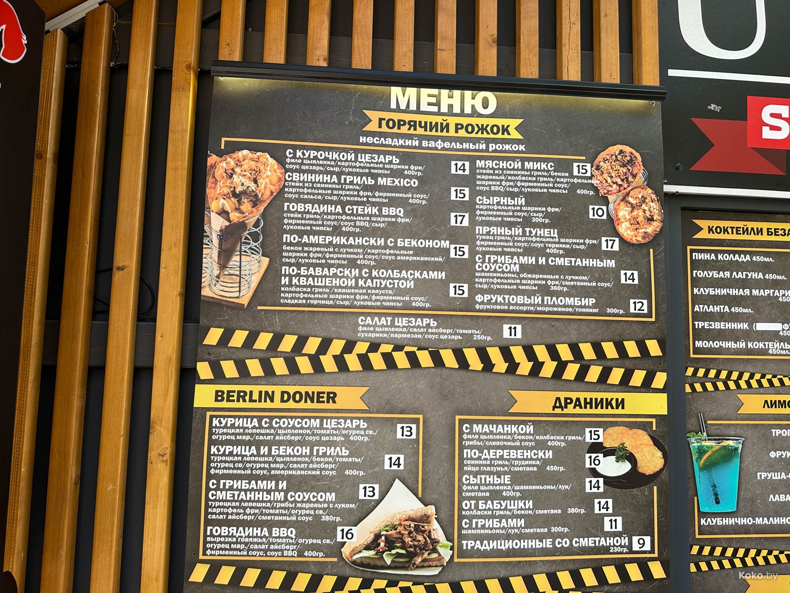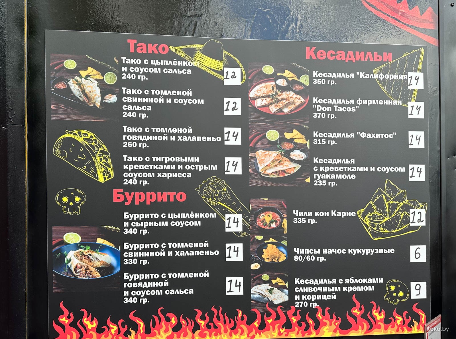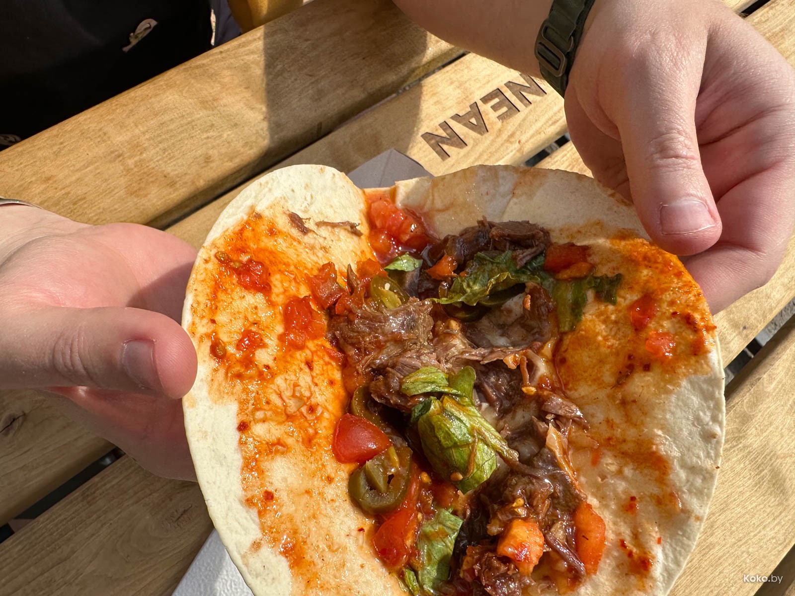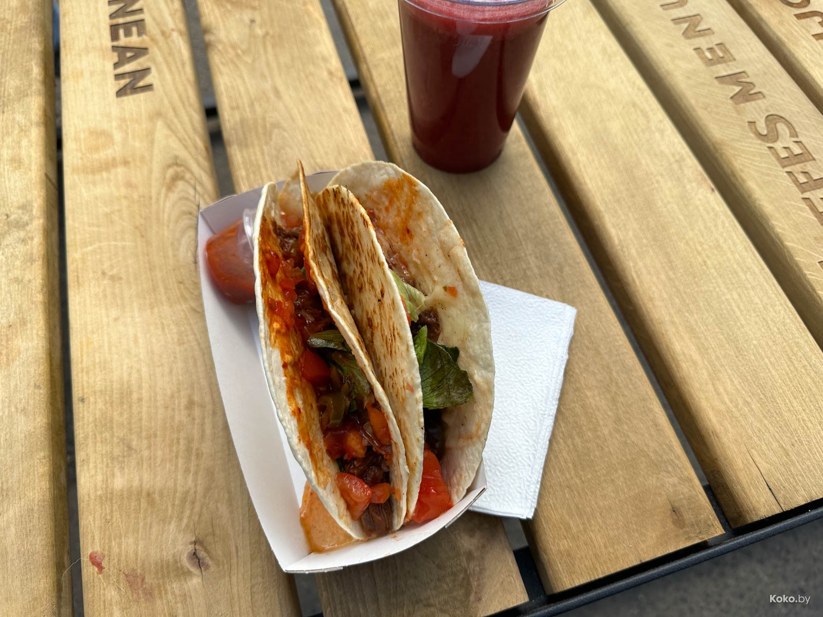 1. Выбор по еде хлюпенький, без фантазии: блины, картошка, бургеры, хот-доги. Пришлось рисковать, опираясь лишь на опыт. Заказал два тако с рваной говядиной в кисло-сладком соусе за 14byn - дорого. Выглядит пустым, отсутствует хоть какая зелень типа кинзы, но вполне вкусно.