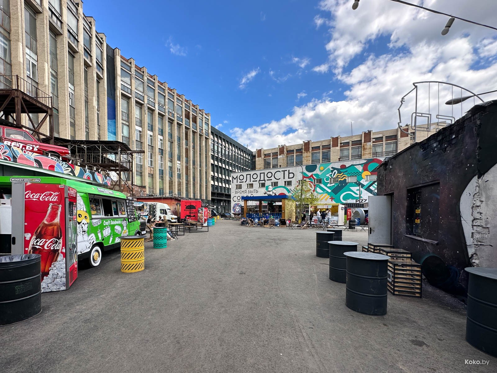 Больше всего угнетает вид на внутренний фасад старого завода, его стены вгоняют в уныние, поэтому вверх лучше не смотреть.