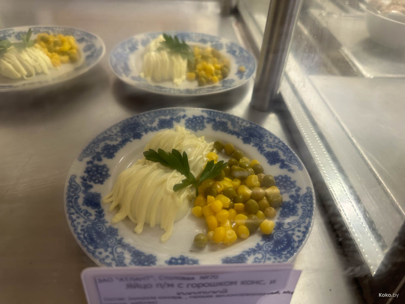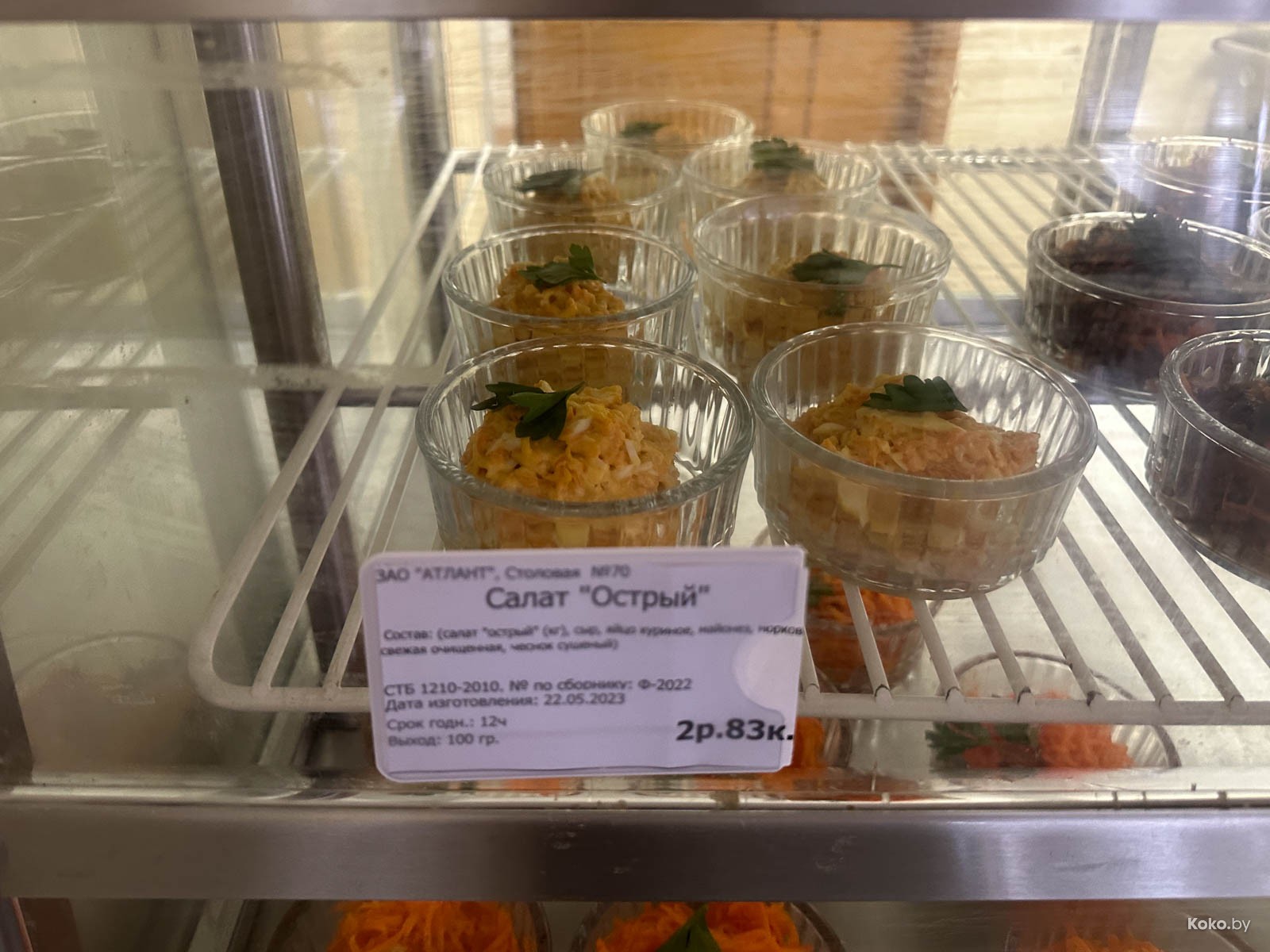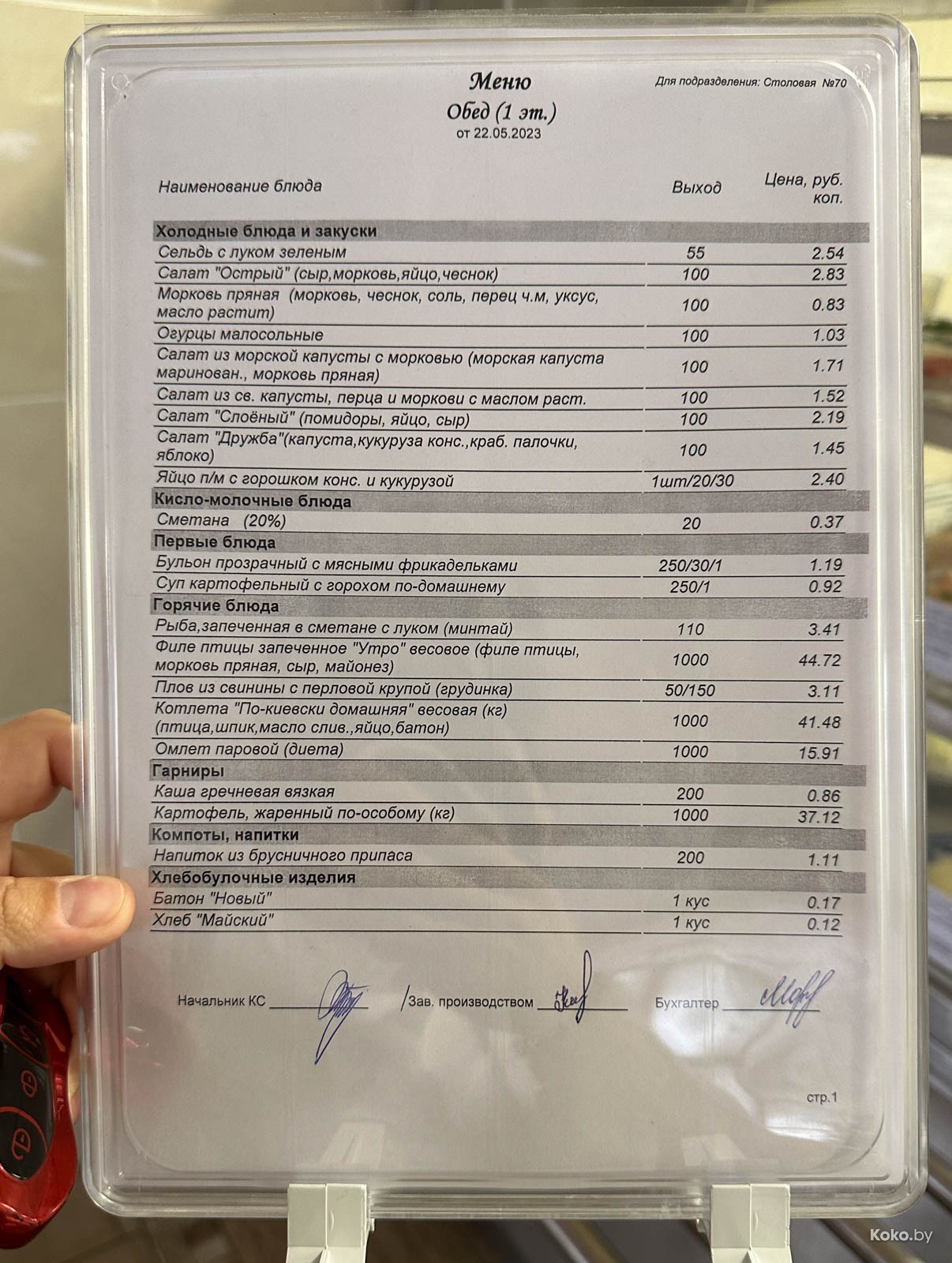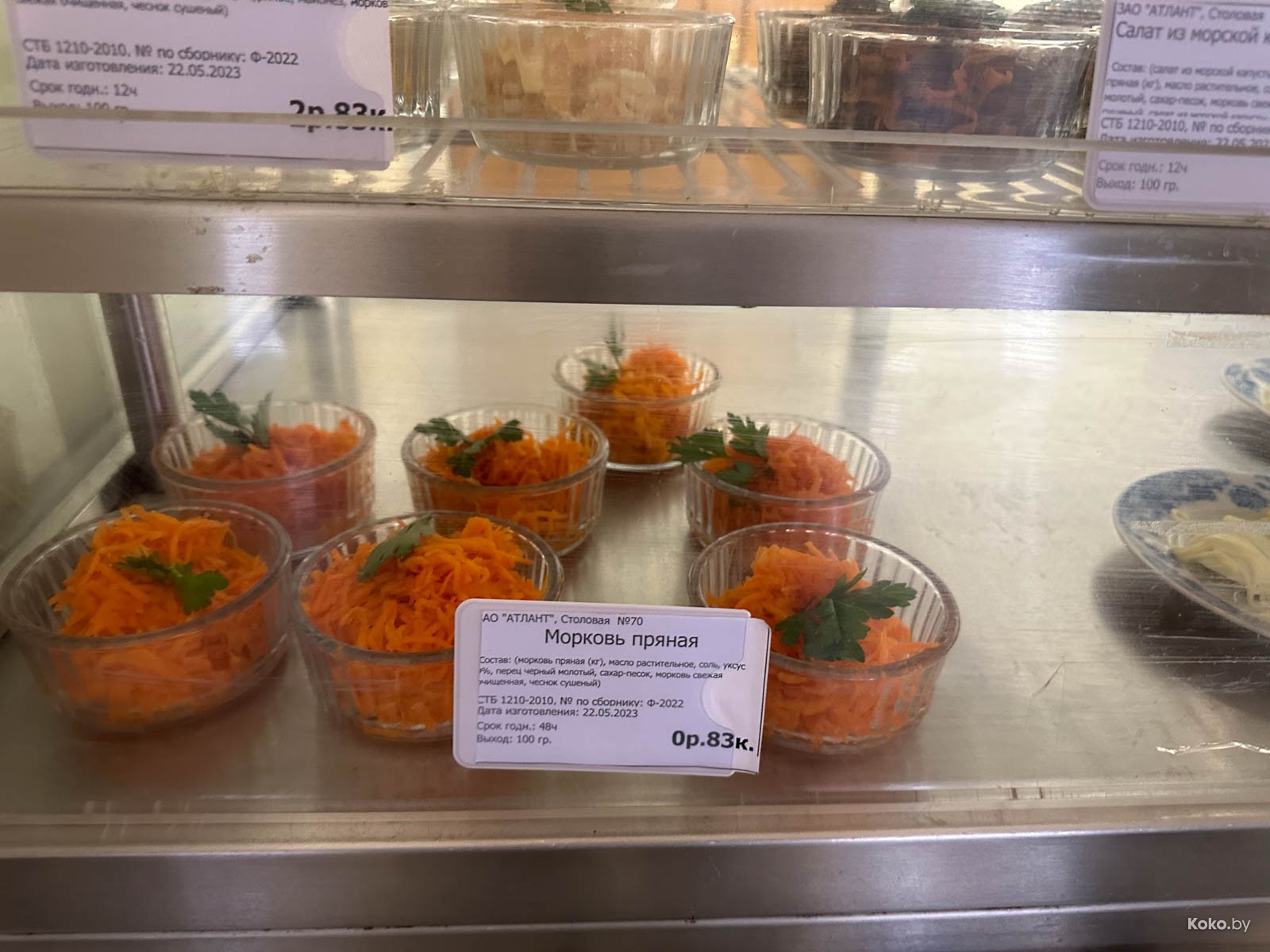 Меню ёмкое, состоит из ГОСТовских блюд столовой кухни без фантазии, типа: пряная морковка за 83 копейки, яйцо под майонезом за 2,40byn, дружный салат из капусты за 1,45byn и плов из перловки. Скучно.