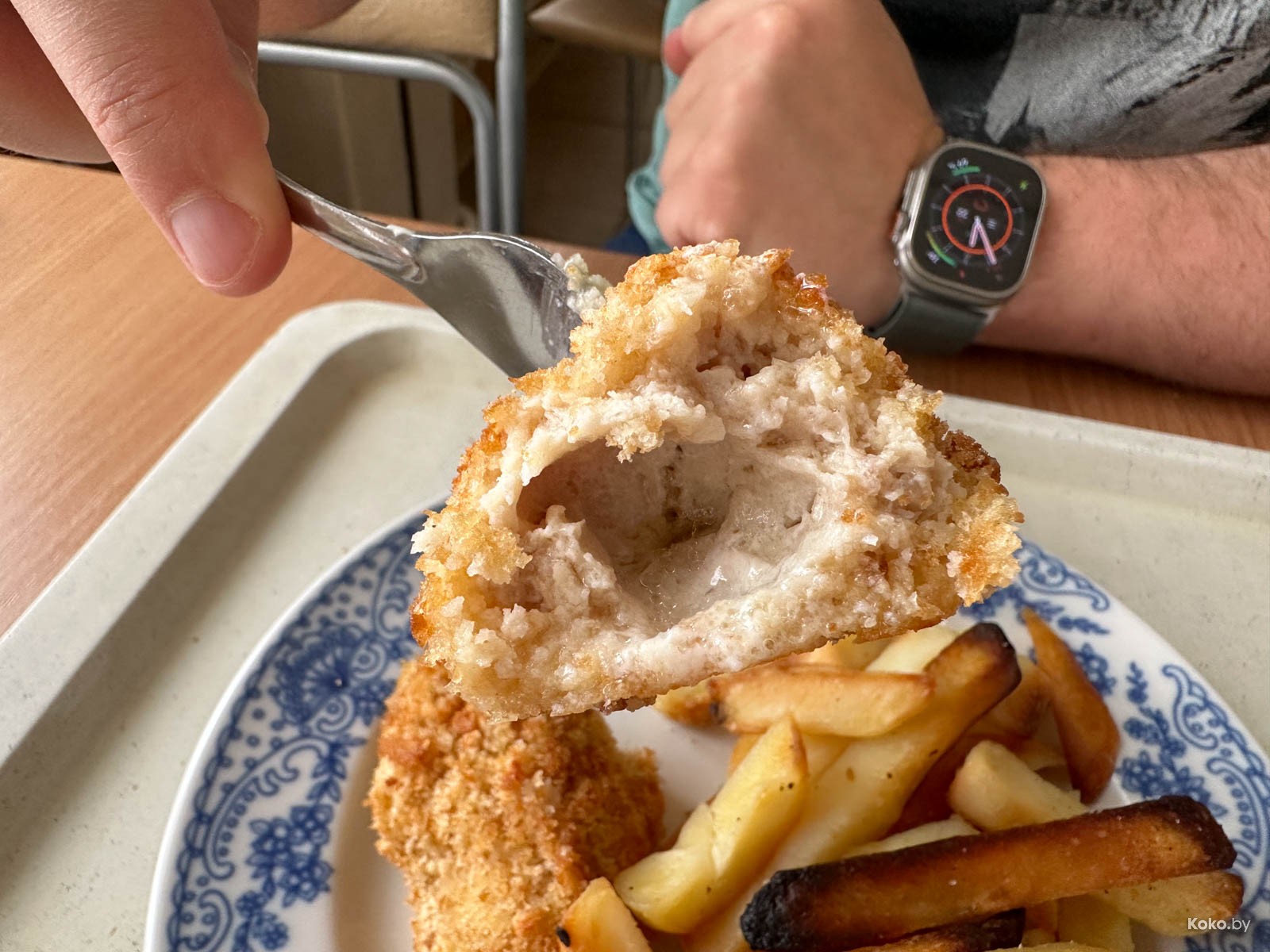 4. В форме дирижабля чуть тёплая натуральная куриная котлета в сухарях за 5,56byn, смачно, но внутри сухая, масло куда-то впиталось. На образце с петрушкой, а по факту нет. Для кого образец выставлен?