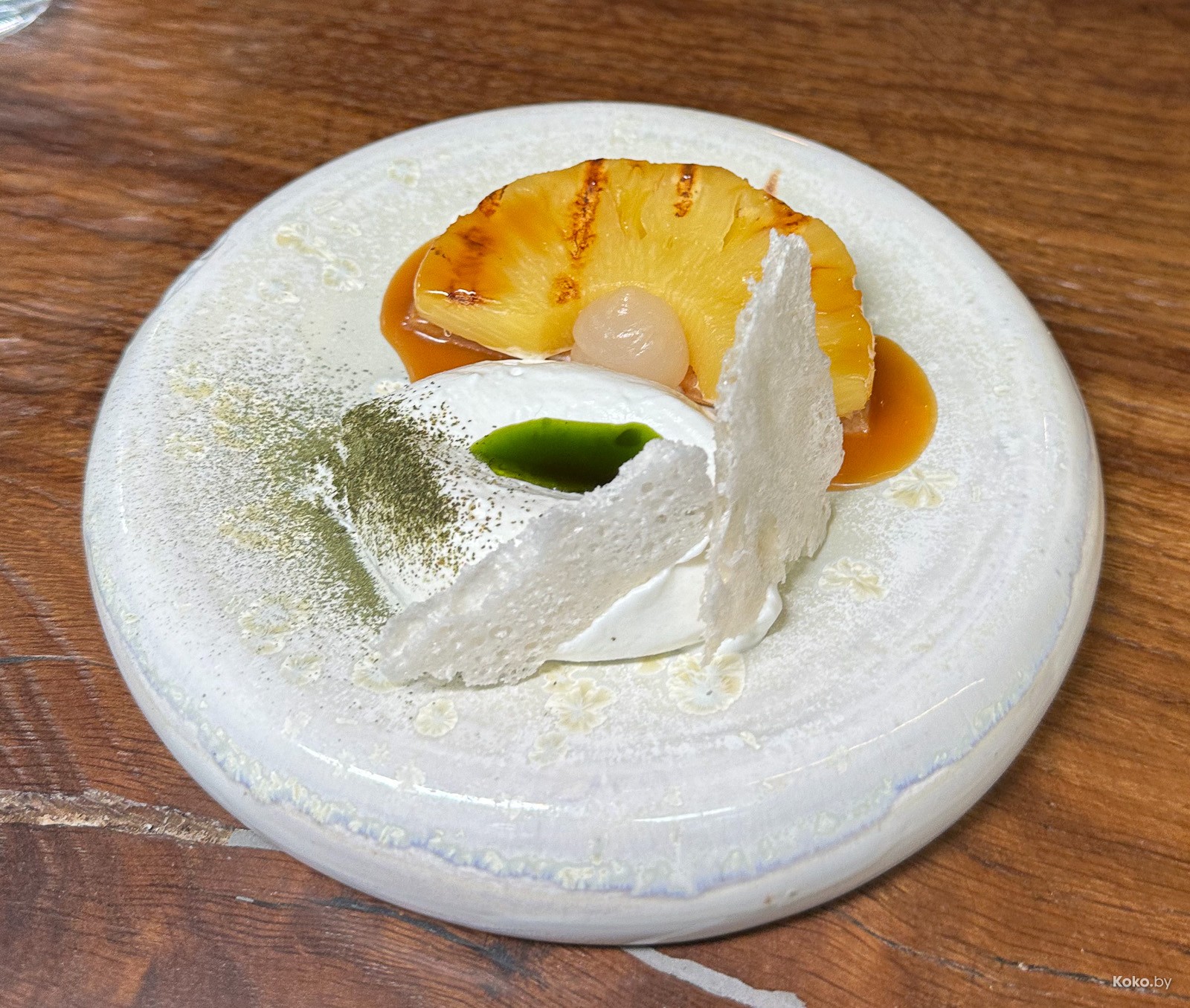 1. Жареный кусочек сиротского ананаса на печенье с разными кремами и сладостями под мятным маслом - 15byn. Перебор со вкусами.