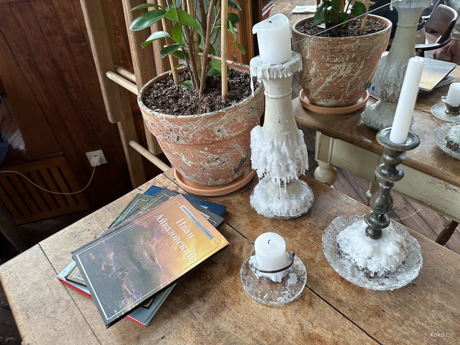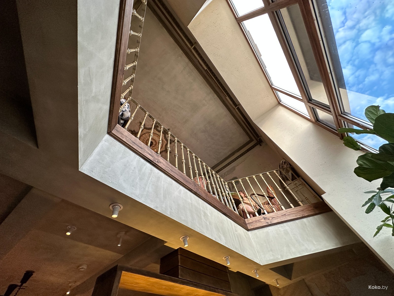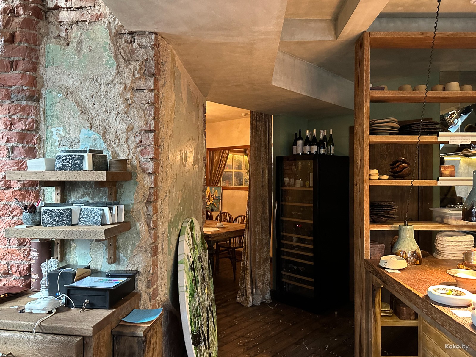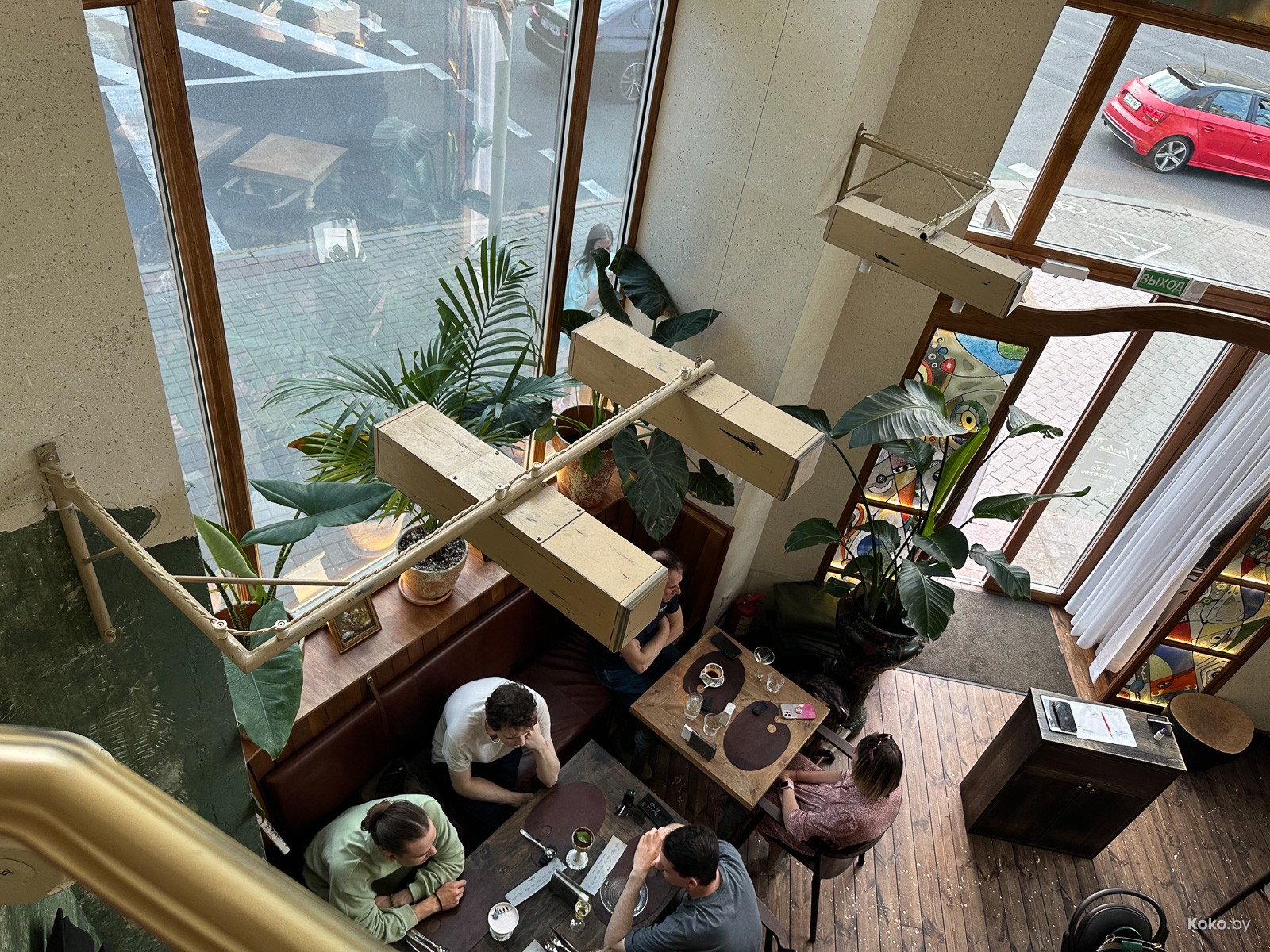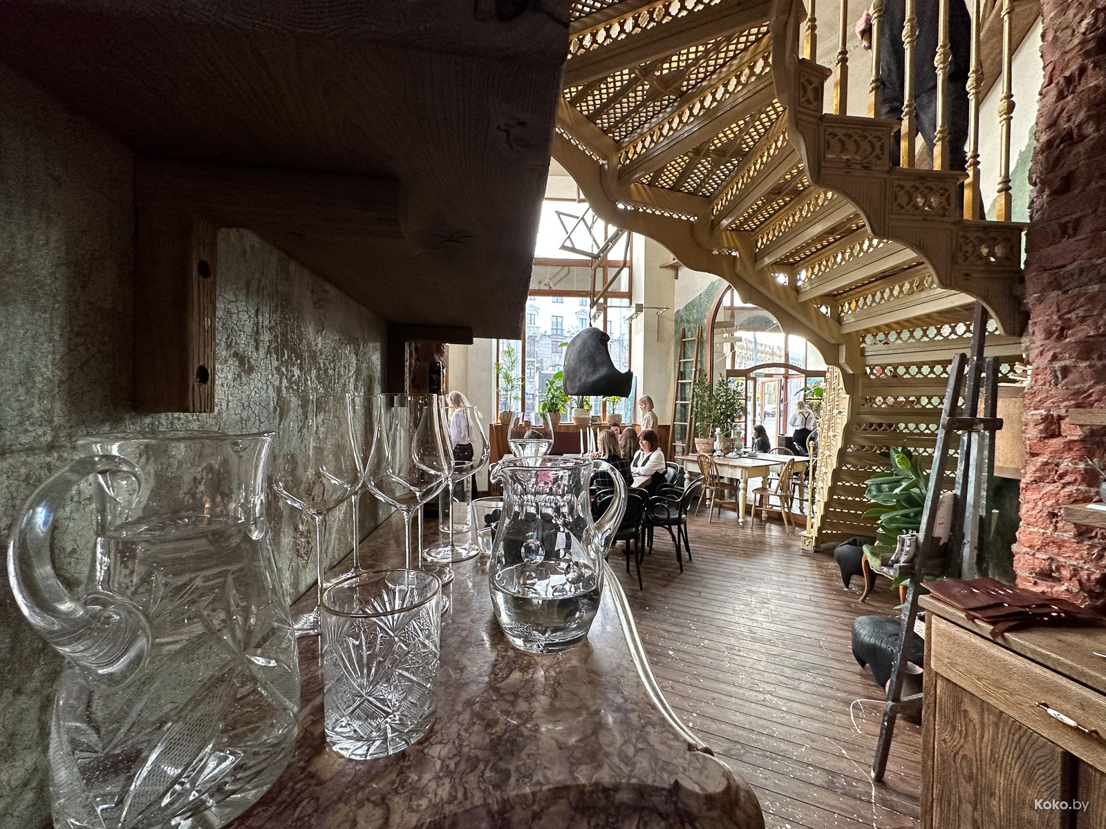 Реально, как действующая художественная мастерская очень чистоплотного художника. Множество уникальных элементов дизайна, грубое дерево, зеркала и кованая лестница на второй ярус, где уже ждёт бармен. Если не угадывать, что хотел сказать автор, то получается действительно уютно, как в старой квартире богатого дядюшки.