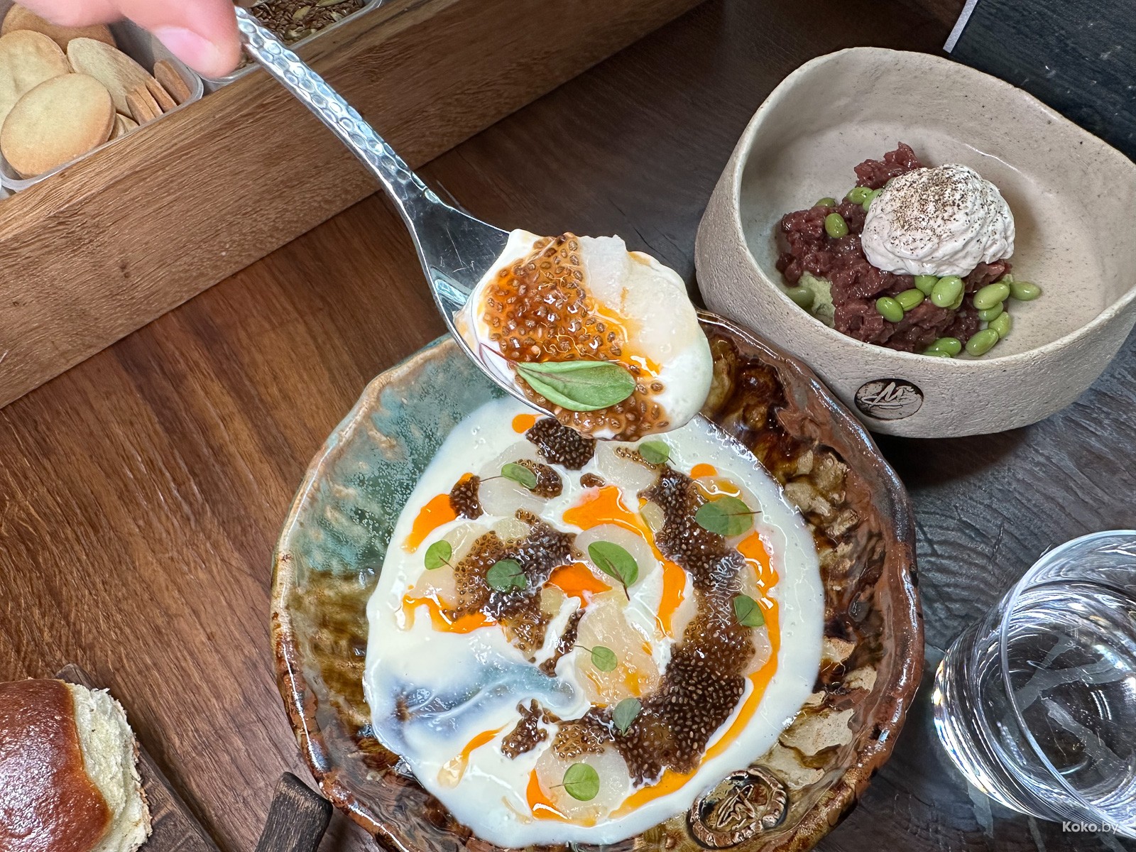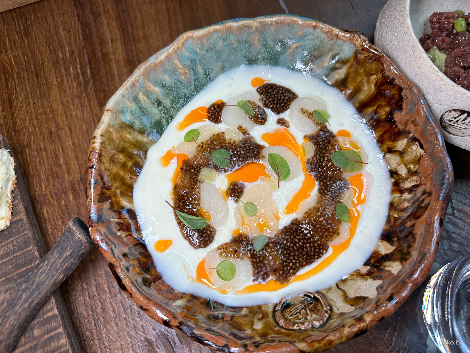 2. Нарезанные мелкие гребешки в густой луже из яйца с вегетарианской икрой из семян чиа - 28byn. Чувствуется всё, кроме вкуса гребешков, тут они выполняют роль нежной текстуры. Для старта выберите их.