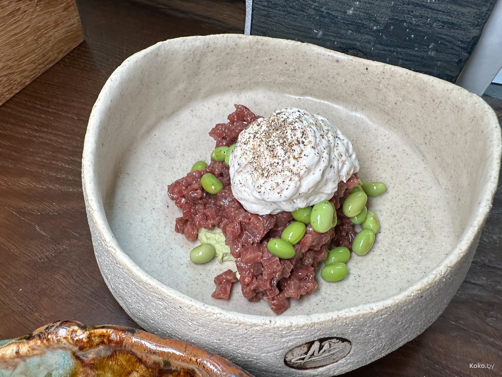 1. В стол одновременно красиво заходят три закуски. Средняя порция мясного тартара из говядины с ореховым муссом и соевыми бобами за 23byn. Мясо упругое, слегка пресное, не уважаю муссы на мясе.