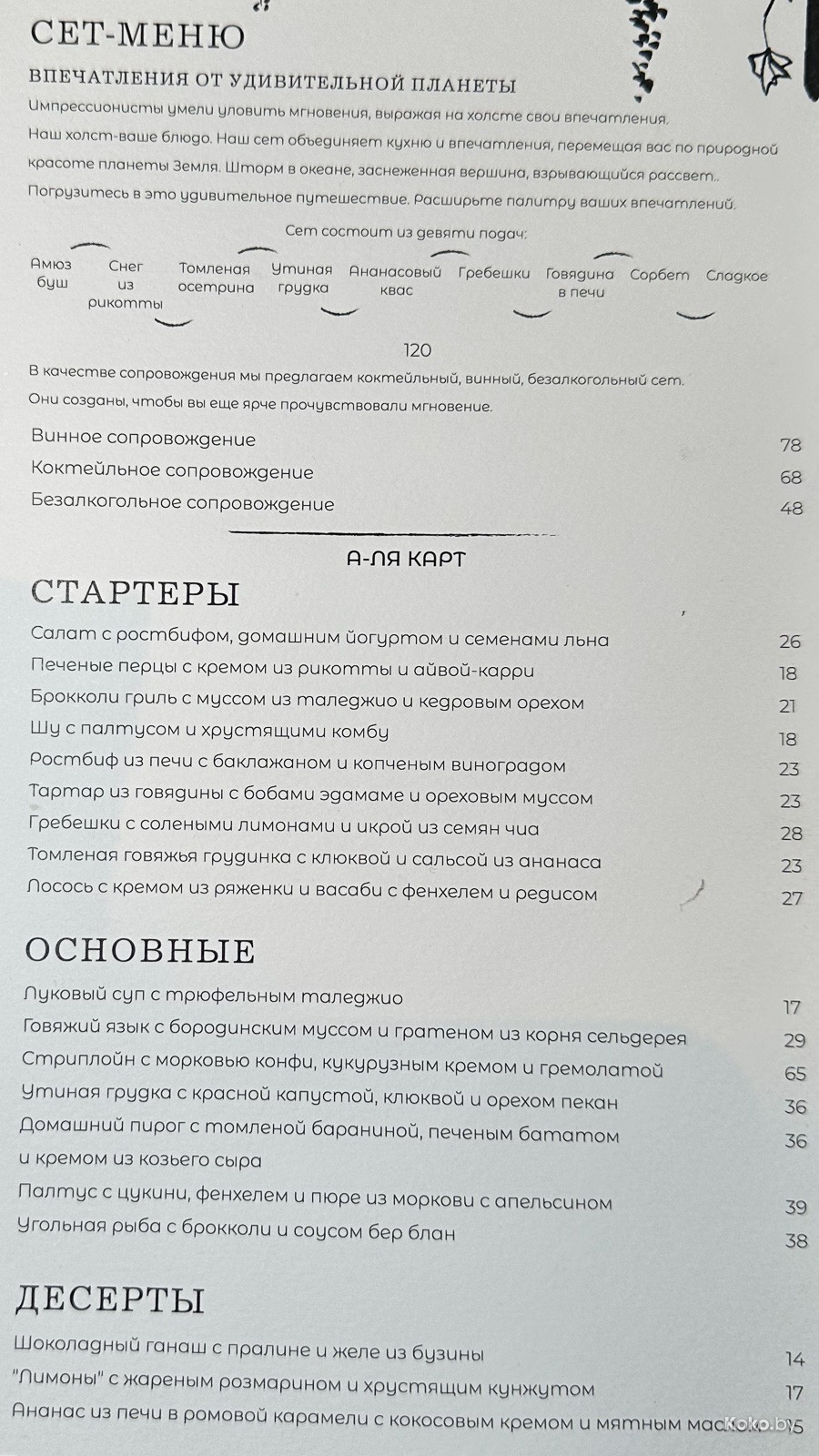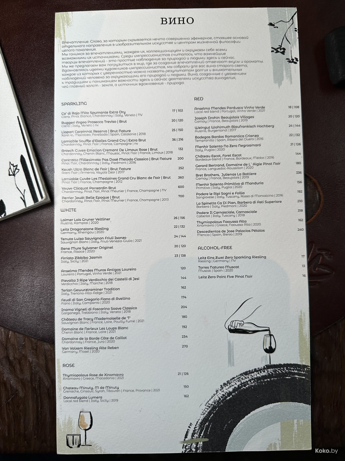 Меню создано удивлять, поэтому уместилось на одной странице. Разбив копилку на 120byn, можно заказать спец сет из девяти блюд, который покажет на что способна кухня. Обзор на него оформлю позже.