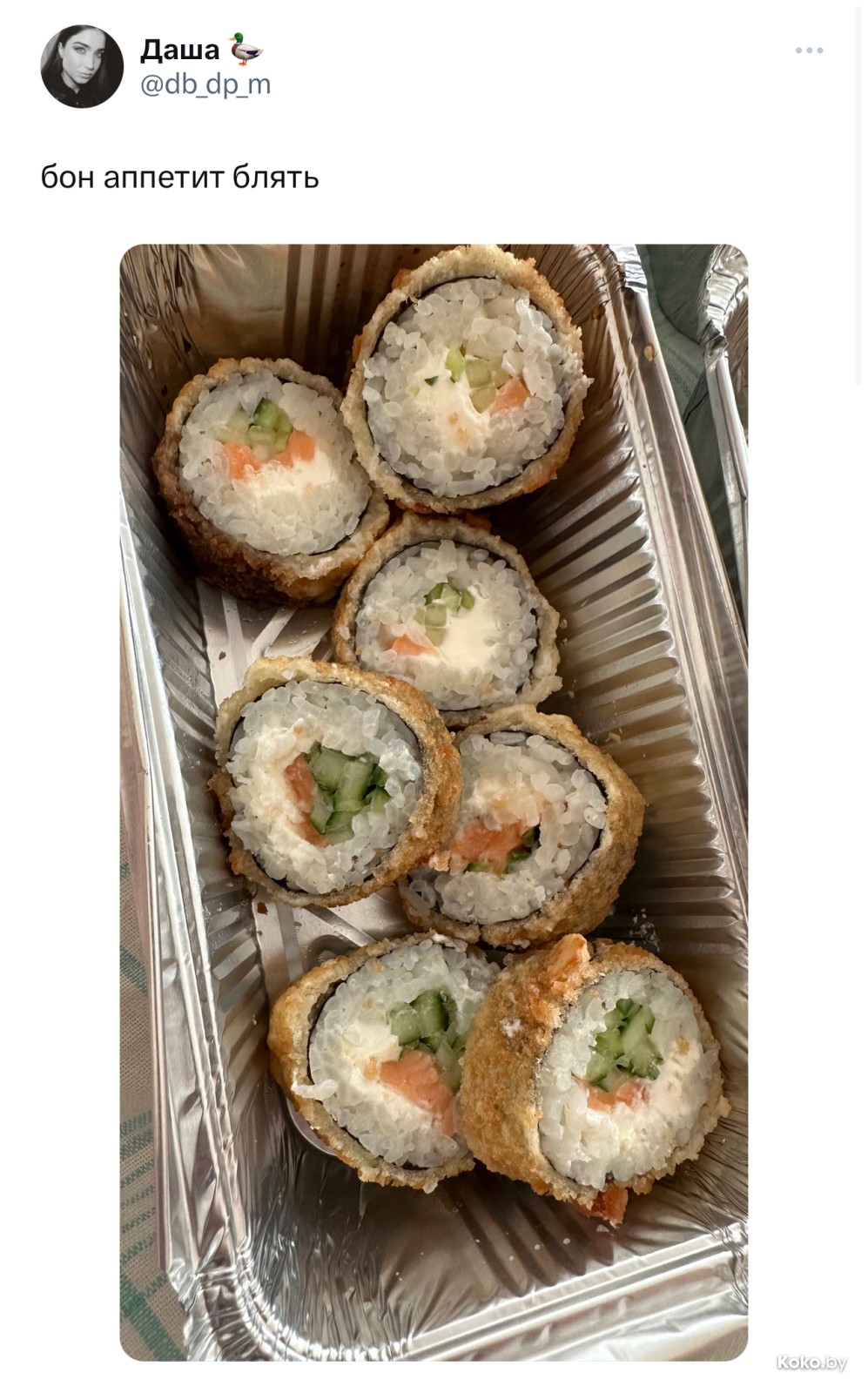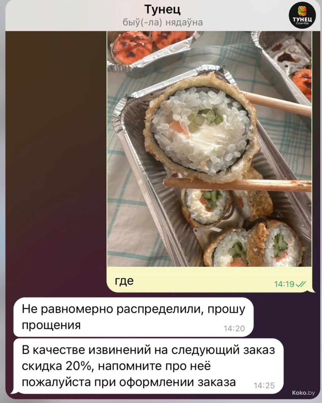 В этом случае Дарья пожаловалась на количество лосося в хот-ролле за 11,80byn. На что получила ответ о неравномерном распределении с просьбой простить. Выпускаем барсука на Игуменском тракте, 15.