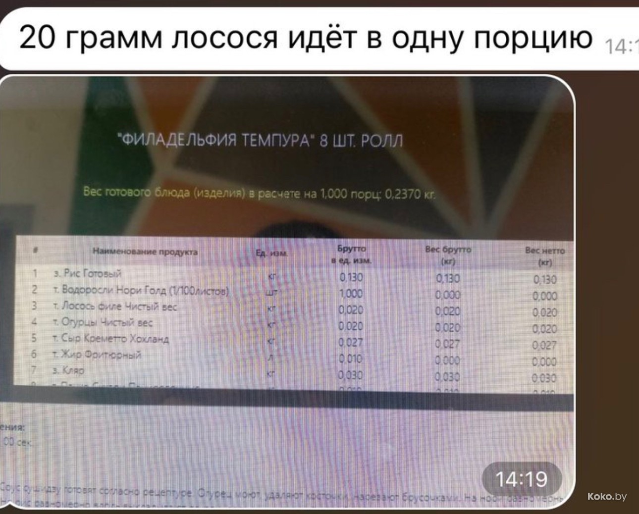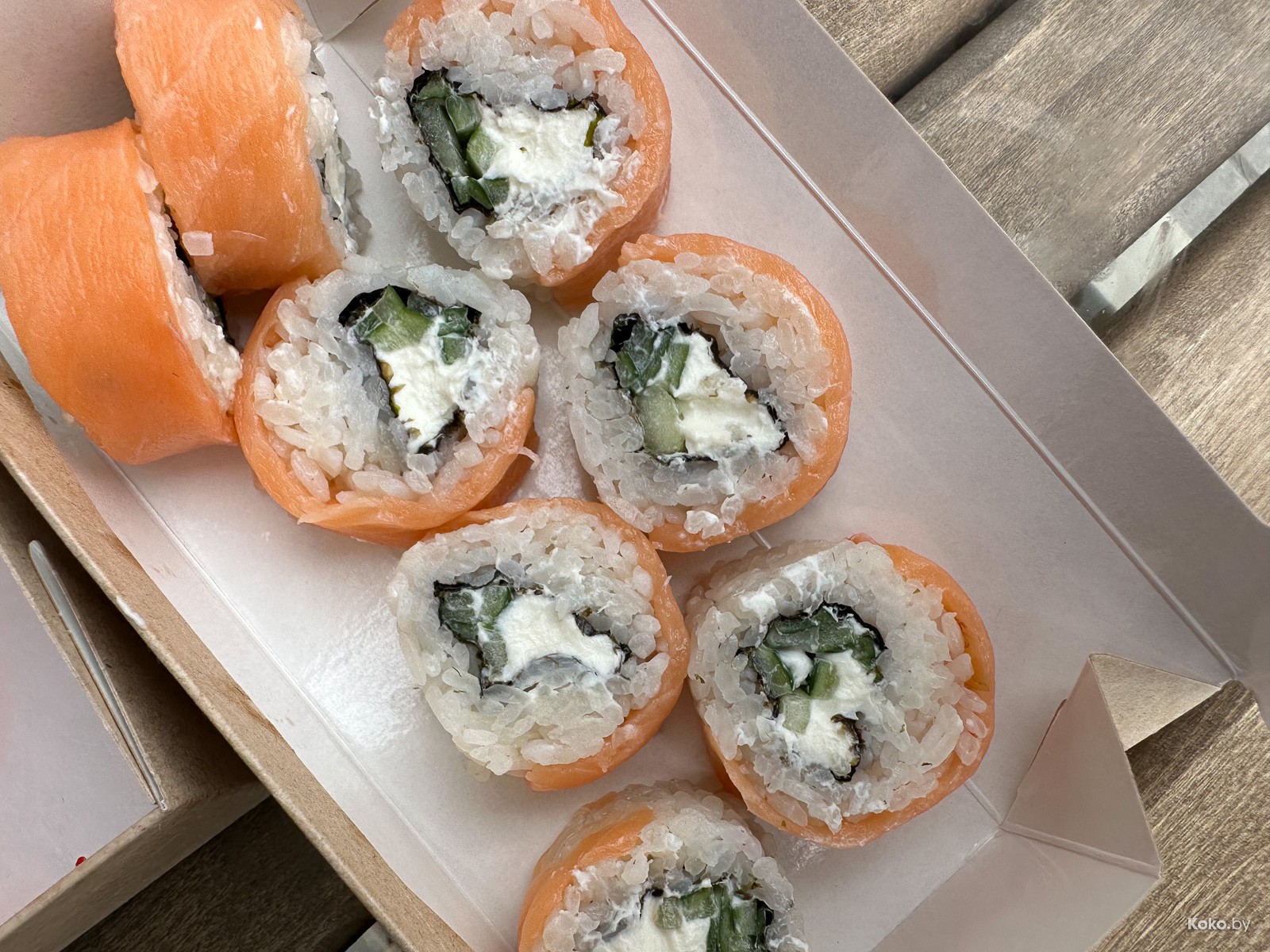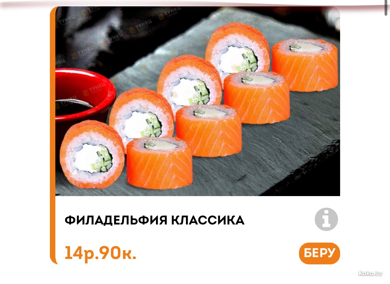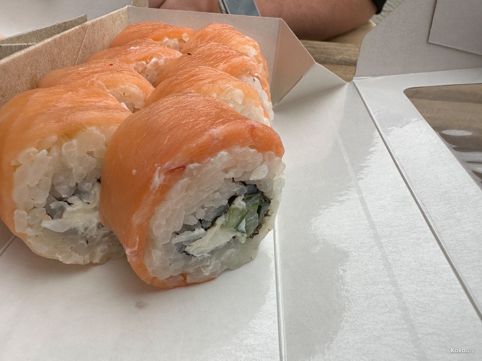 Что ж, проверим, может реально с лососем произошла случайная случайность. На сайте доставки наблюдаю гуманитарную помощь, ролл Дикий люкс Ницца с тигровой креветкой и манго на весь ролл всего 20byn, классическая Филадельфия в толстом лососе - 14,90byn.