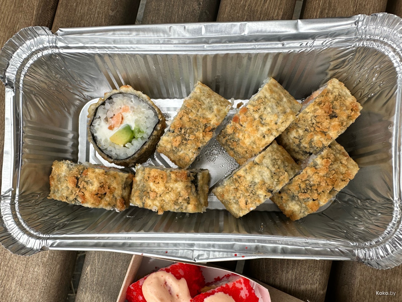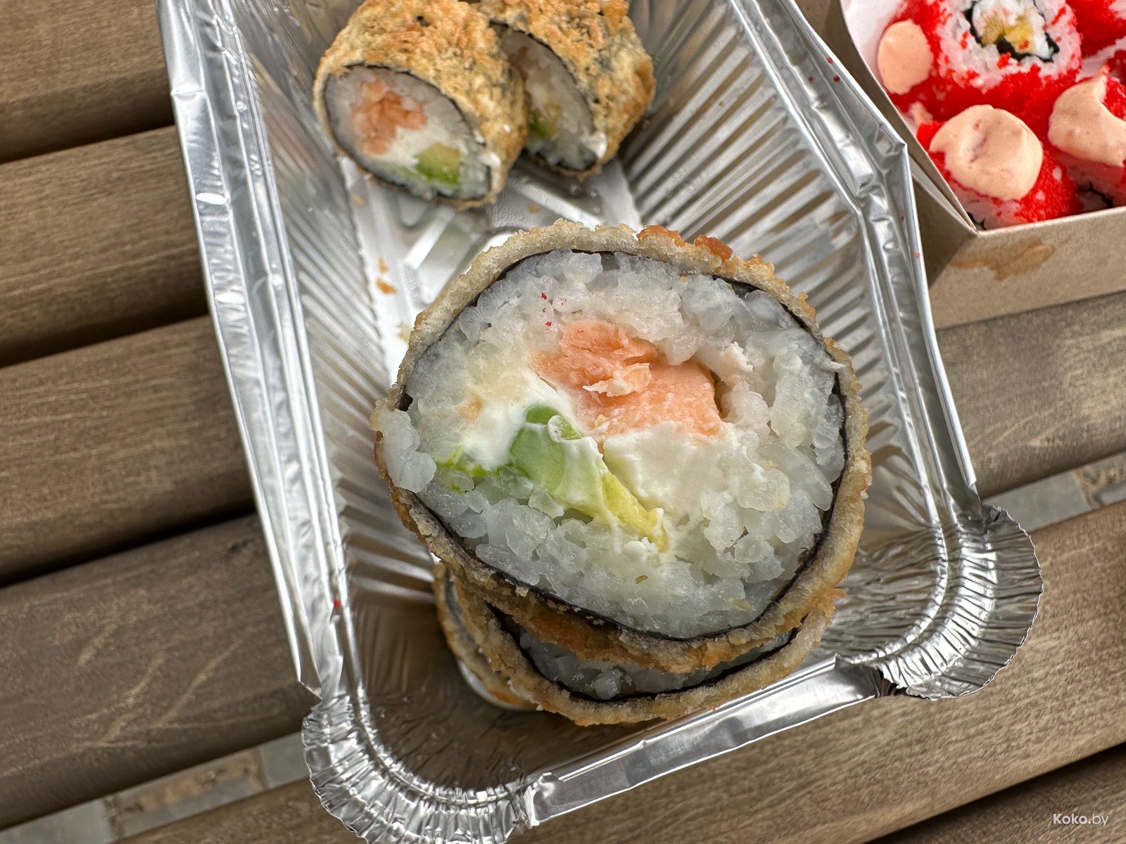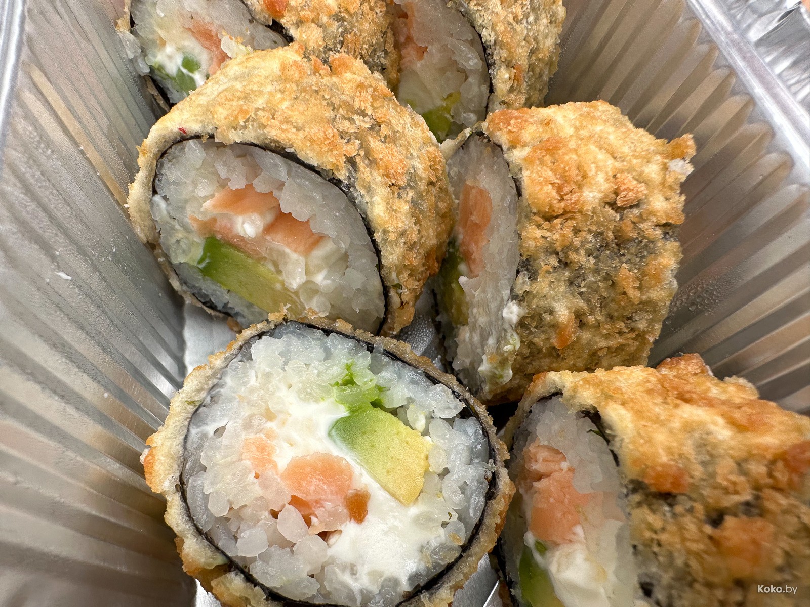 1. Никакого неравномерного распределения, ролл, считай, вегетарианский, из риса с сыром и авокадо в панировке за смешные 11,90byn. Невкусно, из плюсов - цена и мягкий авокадо, потрачено!