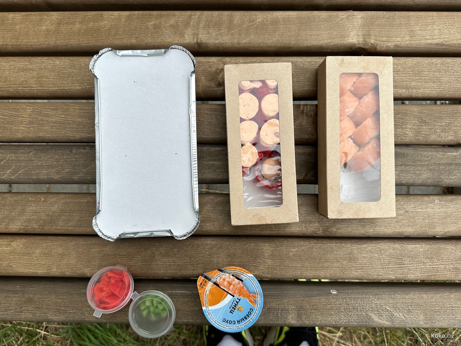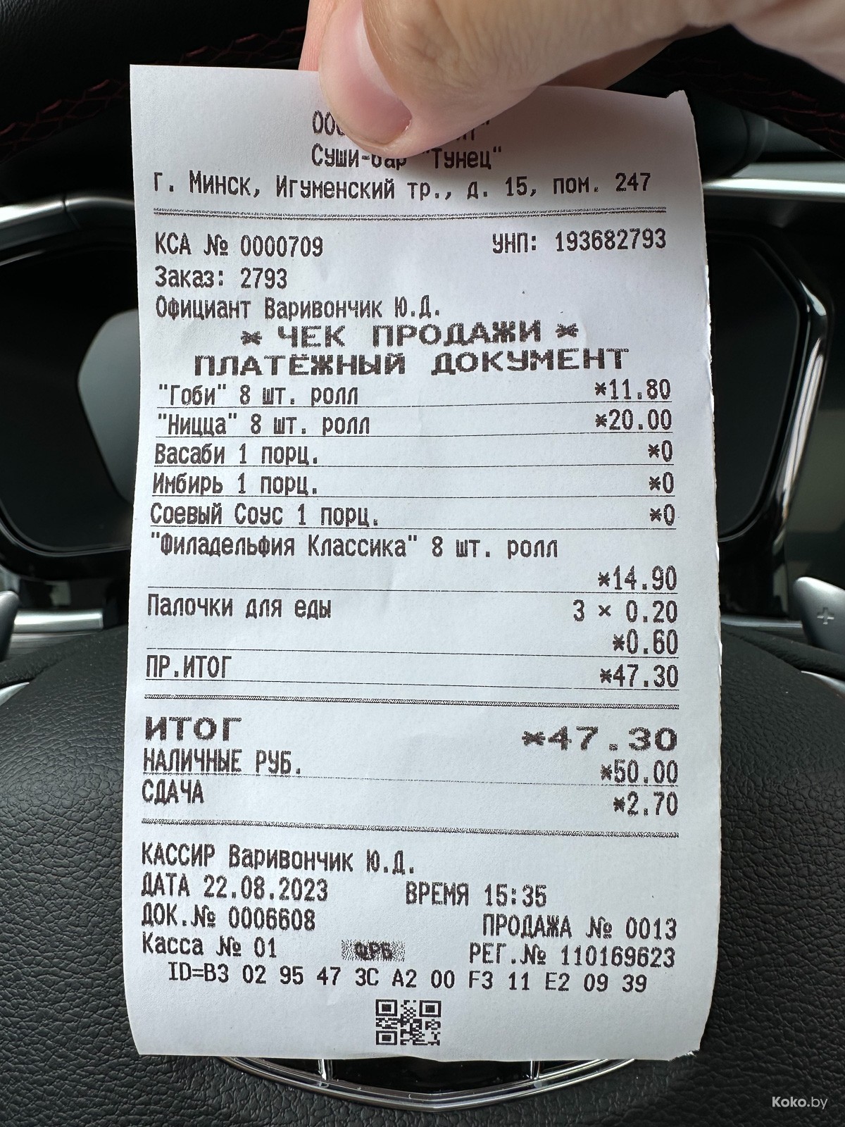 Палочки - за деньги, да, бесплатный гарнир (соя, васаби, имбирь) выдают к Люксовому роллу. За всё 47,30byn, заказ ожидать 25 минут.