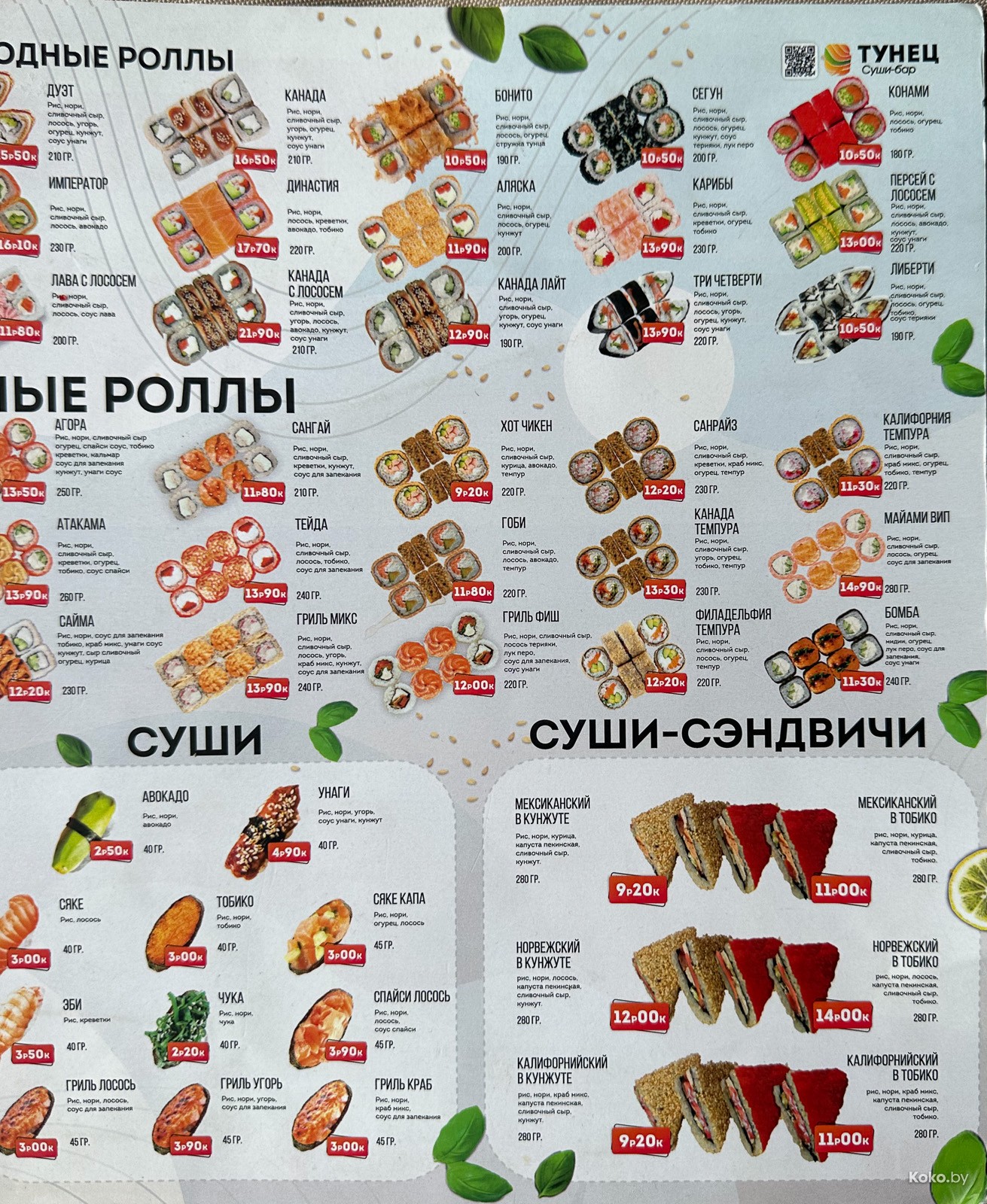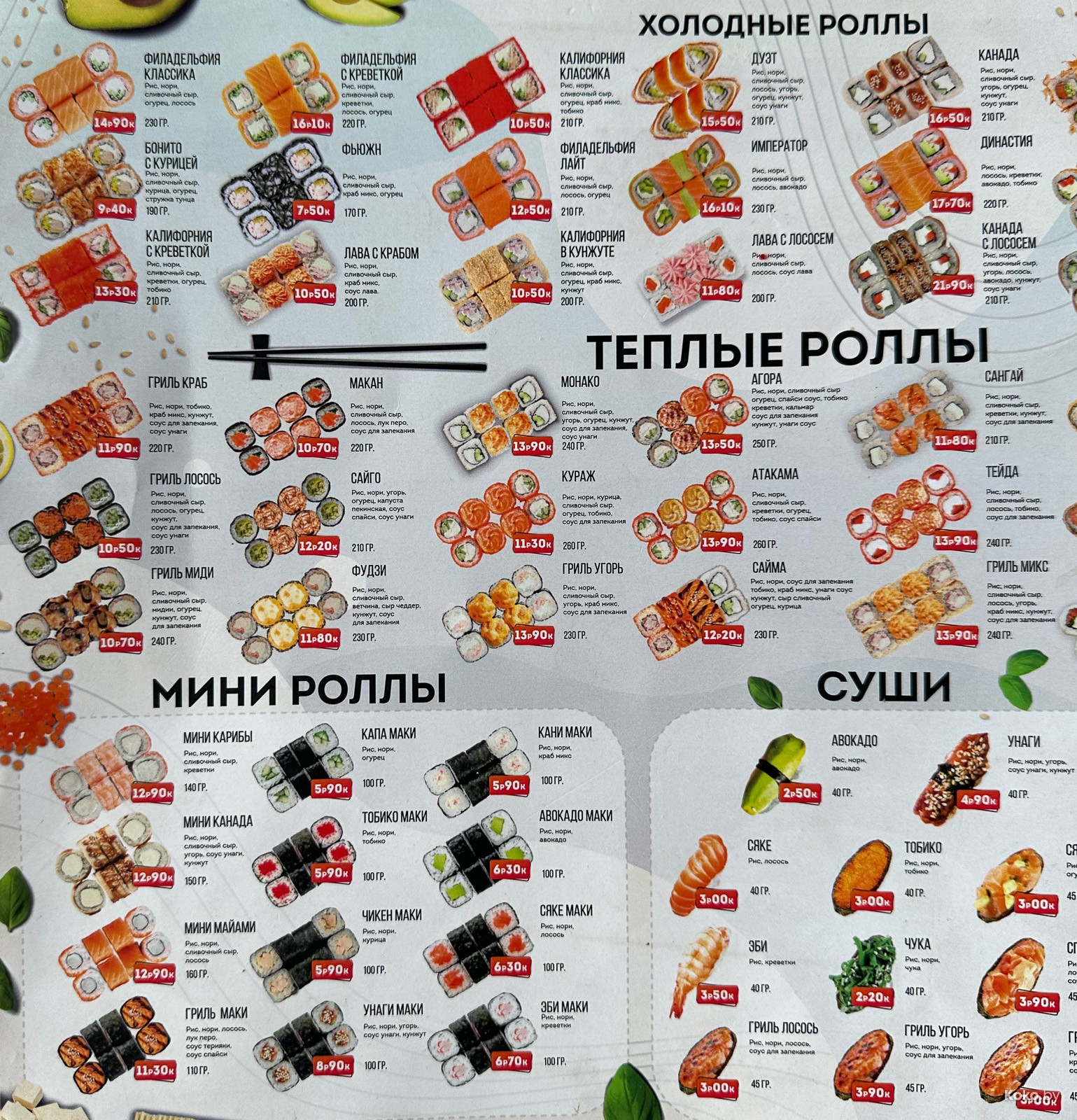 Из последних сушарен гляньте «Кансо», а лучше в «Ронин», вчера собрал сет из разных роллов на Буратино за 53byn, если без нигири, то 43byn.