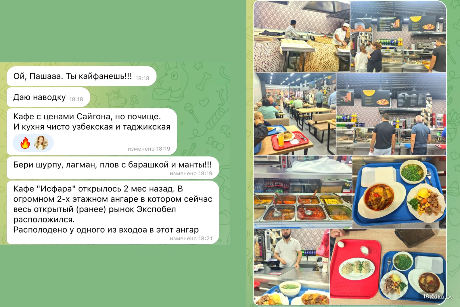 Наводку на город лагмана и плова подкинула наша читательница Ольга, за что ей отдельный поклон. Столовую «Исфара» мы легко нашли в новом корпусе «Экспобела», который построили на кладбище киосков. Заходим через центральный вход, до конца прямо и налево. Следовали мы за густым запахом ароматных специй и только выловленной из печи лепёшки. Аутентичная столовая с линией раздачи, баром свежей выпечки, станцией плова и мясным вертелом.