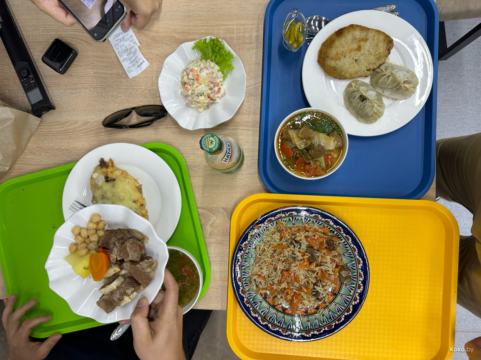 Еда выглядит бодро жирной, 100% не диетическая. Берём на троих: салат Оливье, лагман, шурпа, плов, самая дорогая шаурма с курицей, острые перчики, лимонад, лепёшка, пару мантов, две котлеты. С вас 59 рублей!
