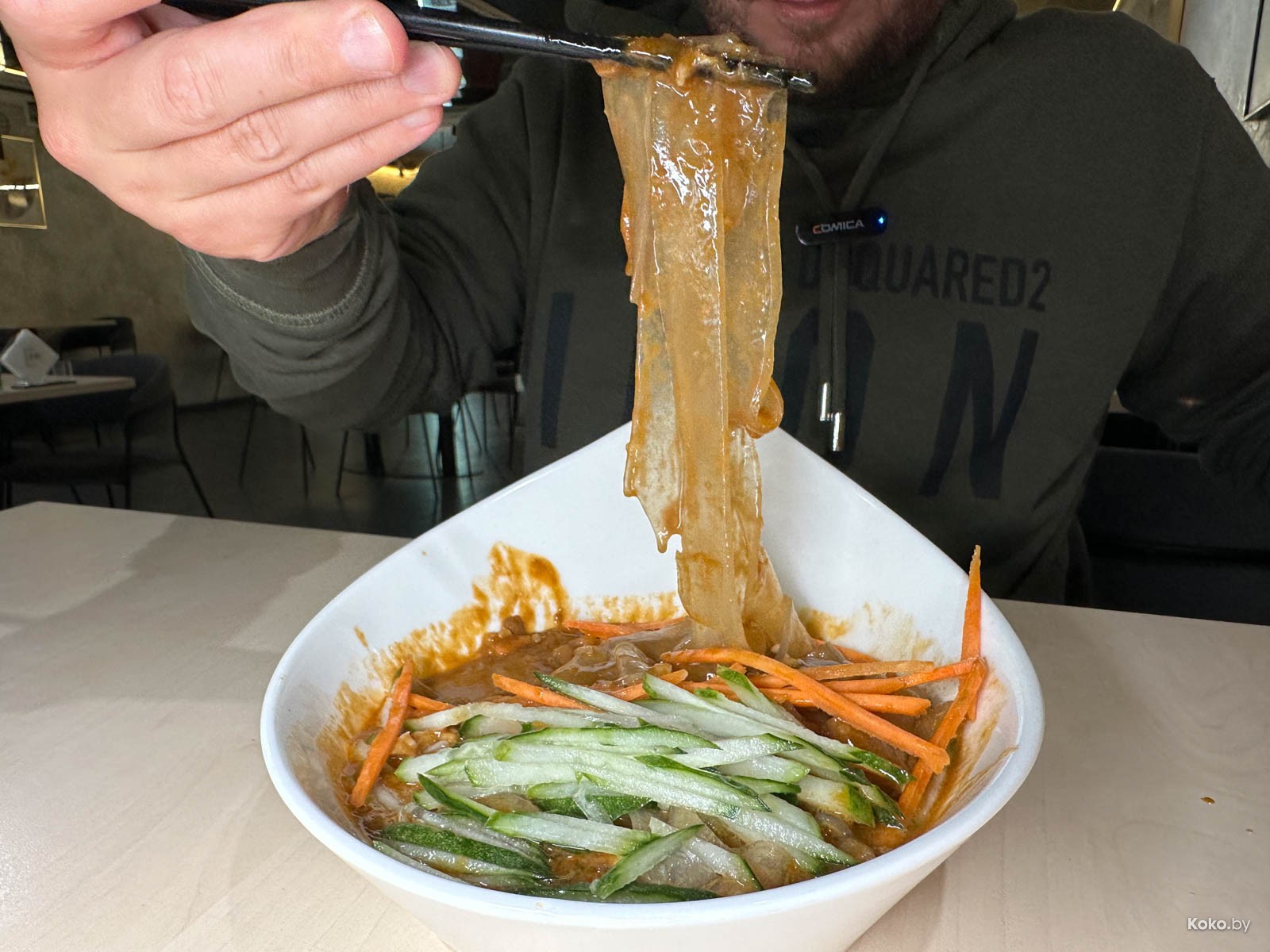 1. На раз-два вынесли миску прозрачной северо-восточной лапши Лапи под двумя видами сезонных овощей за 14р, в супе, похожем на ореховый соус, с ароматом, ни с чем не спутаешь, арахисового масла.