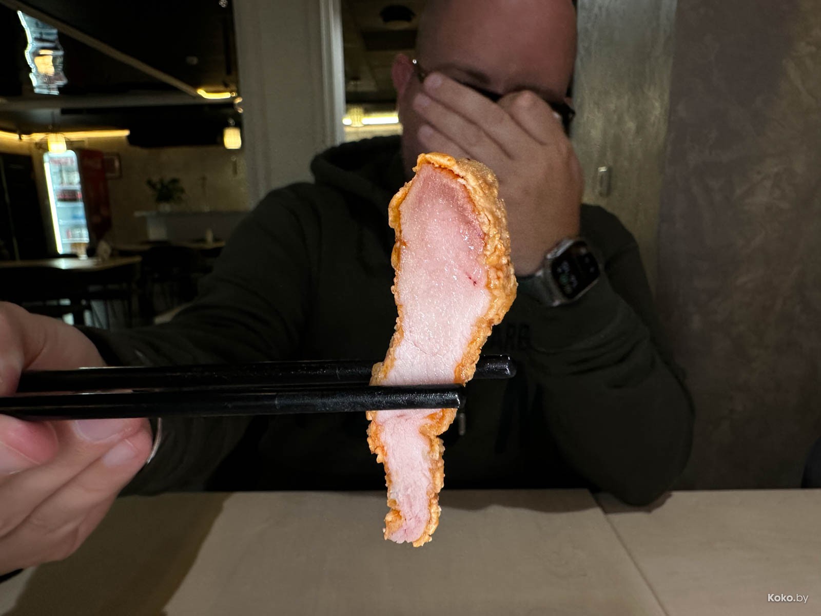 Как оказалось, отбитая свинина идеально сочетается с молотой зирой. Скрипя копилкой, выписываю крепкие 8 кокобаев за рецептуру.