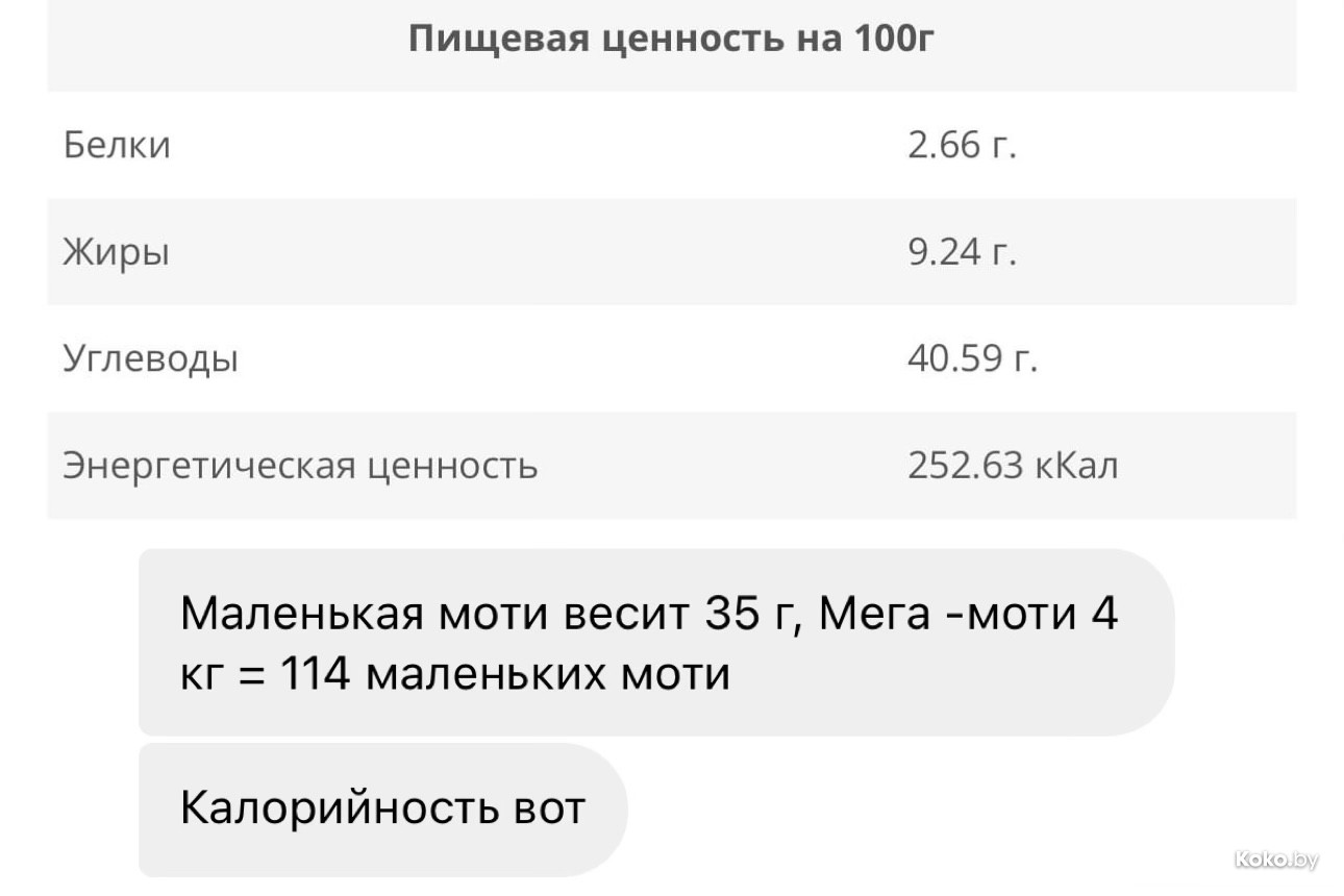 Состоит он в эквиваленте из 114 обычных моти на 252 кКал.
