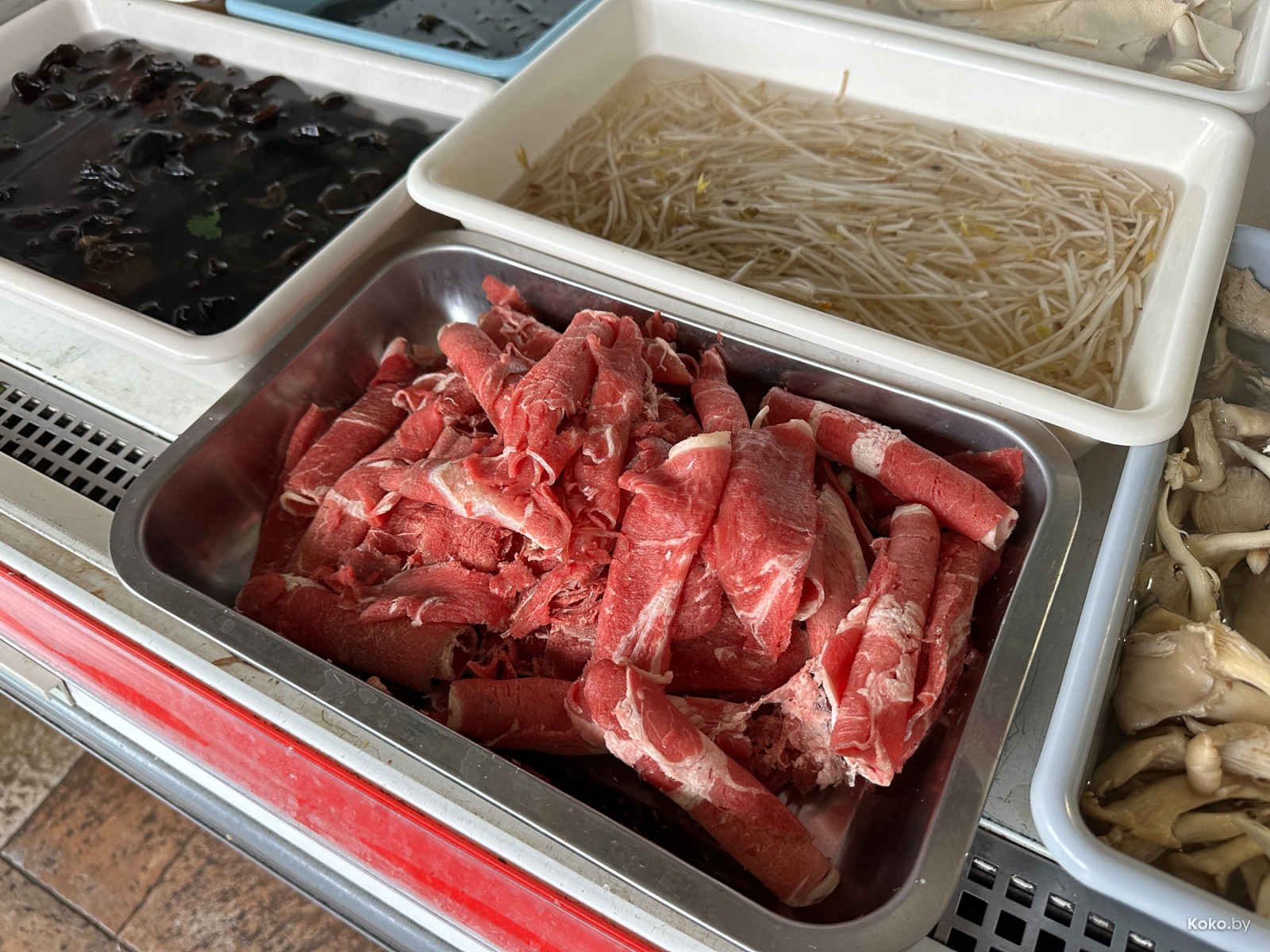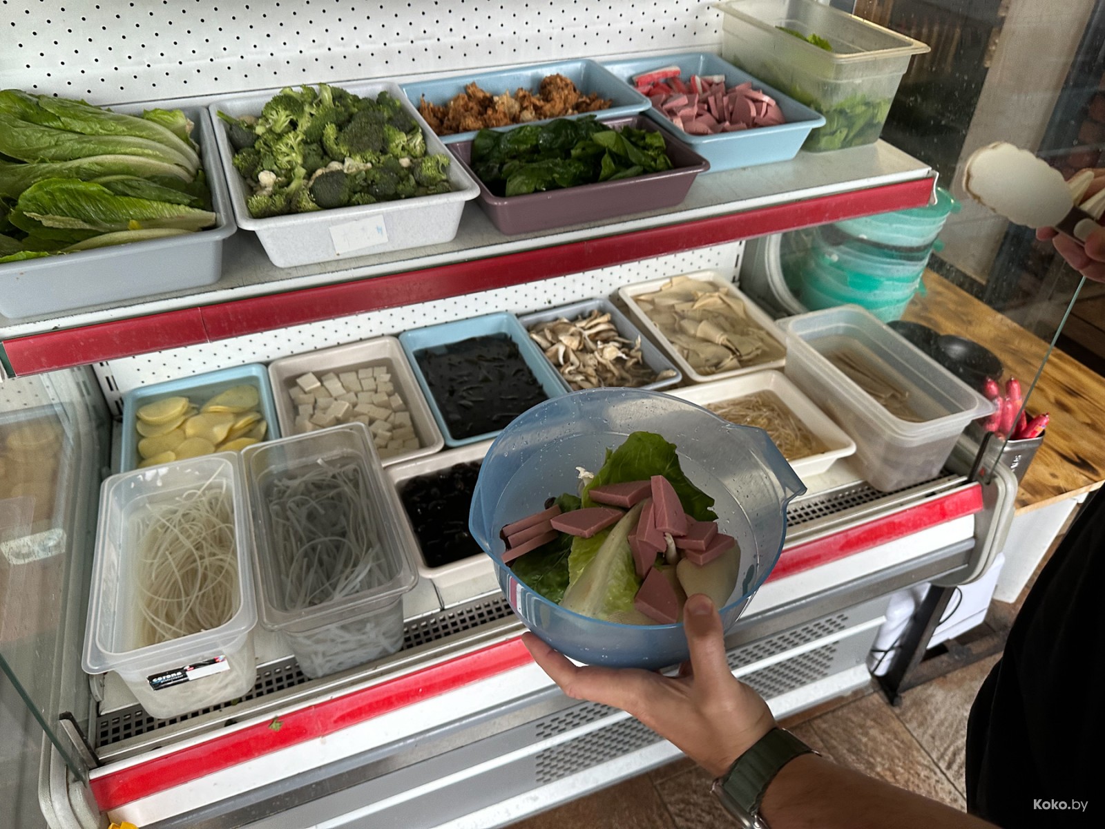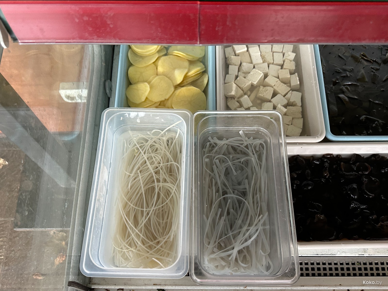 Малатан - это Хо Го для ленивых, из холодильника выбираем, сразу отмечаю, свежие продукты, дальше они сами. Итак, насыпаю в пластиковое ведёрко, что хочу есть: в контейнерах разная зелень, картошка, рубец, дошик, макароны из сыра тофу, наструганная говядина, три вида грибов, неизвестная рыба в кляре и соевые сосиски.