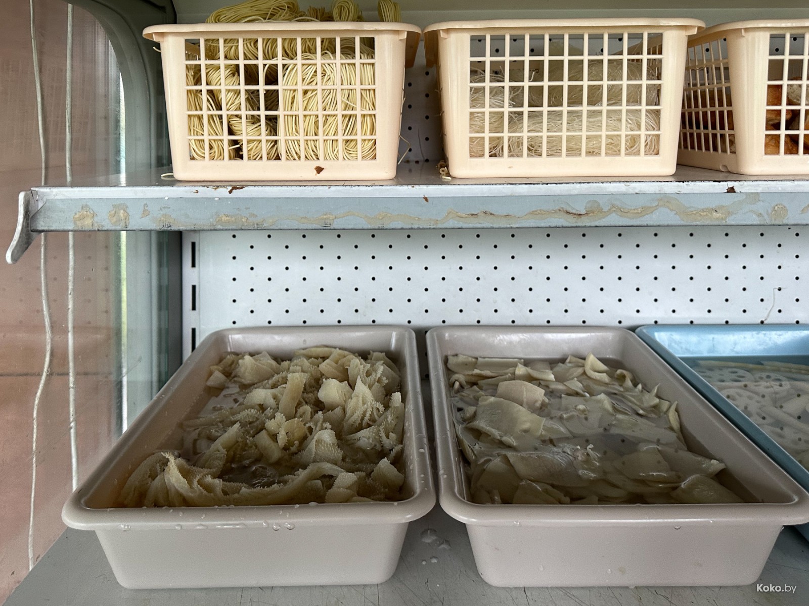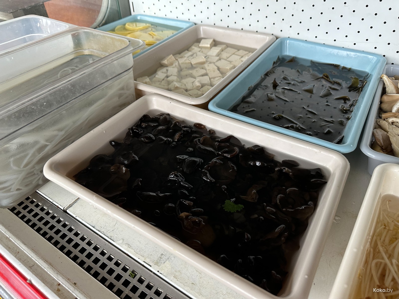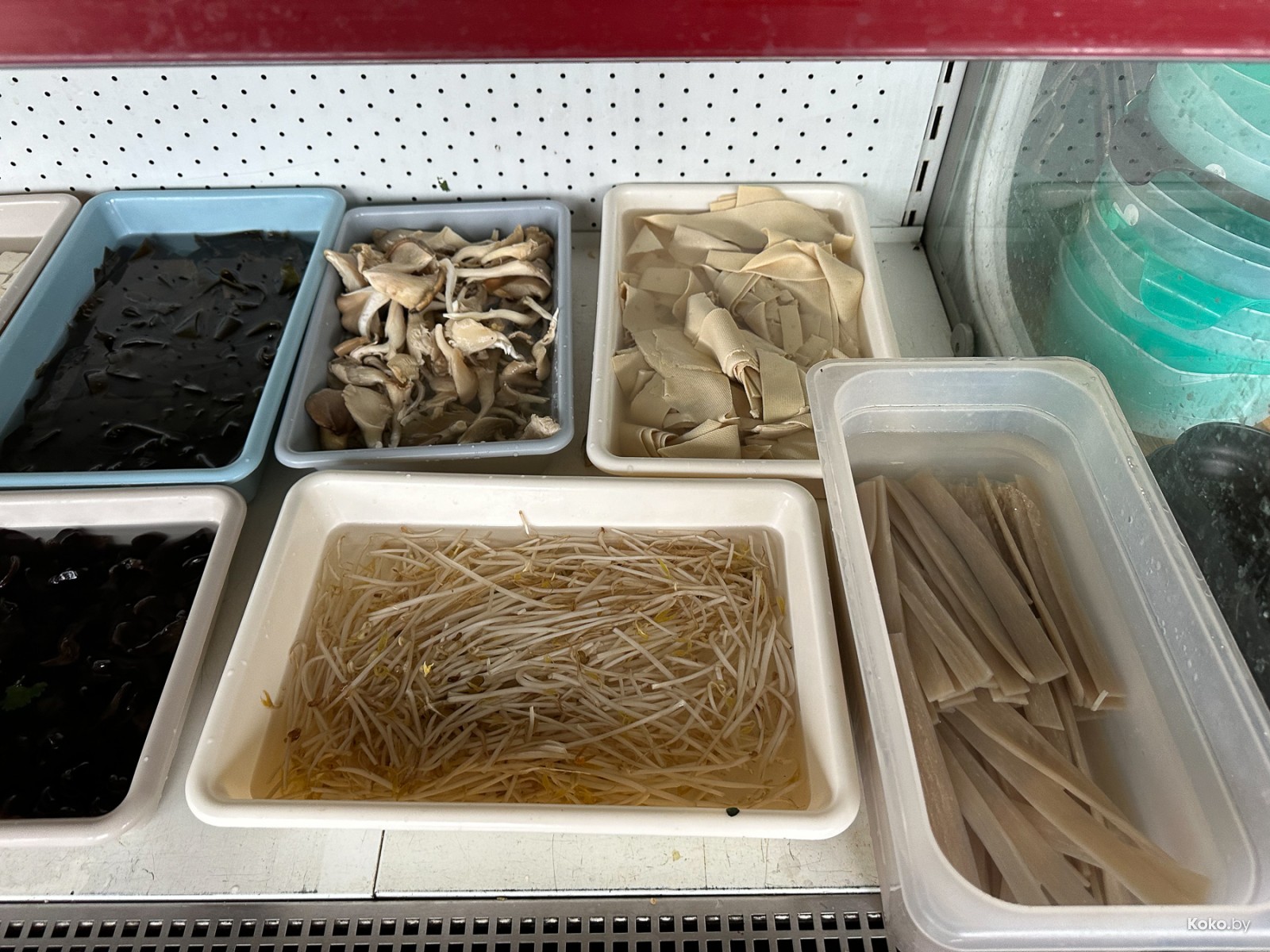 Малатан - это Хо Го для ленивых, из холодильника выбираем, сразу отмечаю, свежие продукты, дальше они сами. Итак, насыпаю в пластиковое ведёрко, что хочу есть: в контейнерах разная зелень, картошка, рубец, дошик, макароны из сыра тофу, наструганная говядина, три вида грибов, неизвестная рыба в кляре и соевые сосиски.