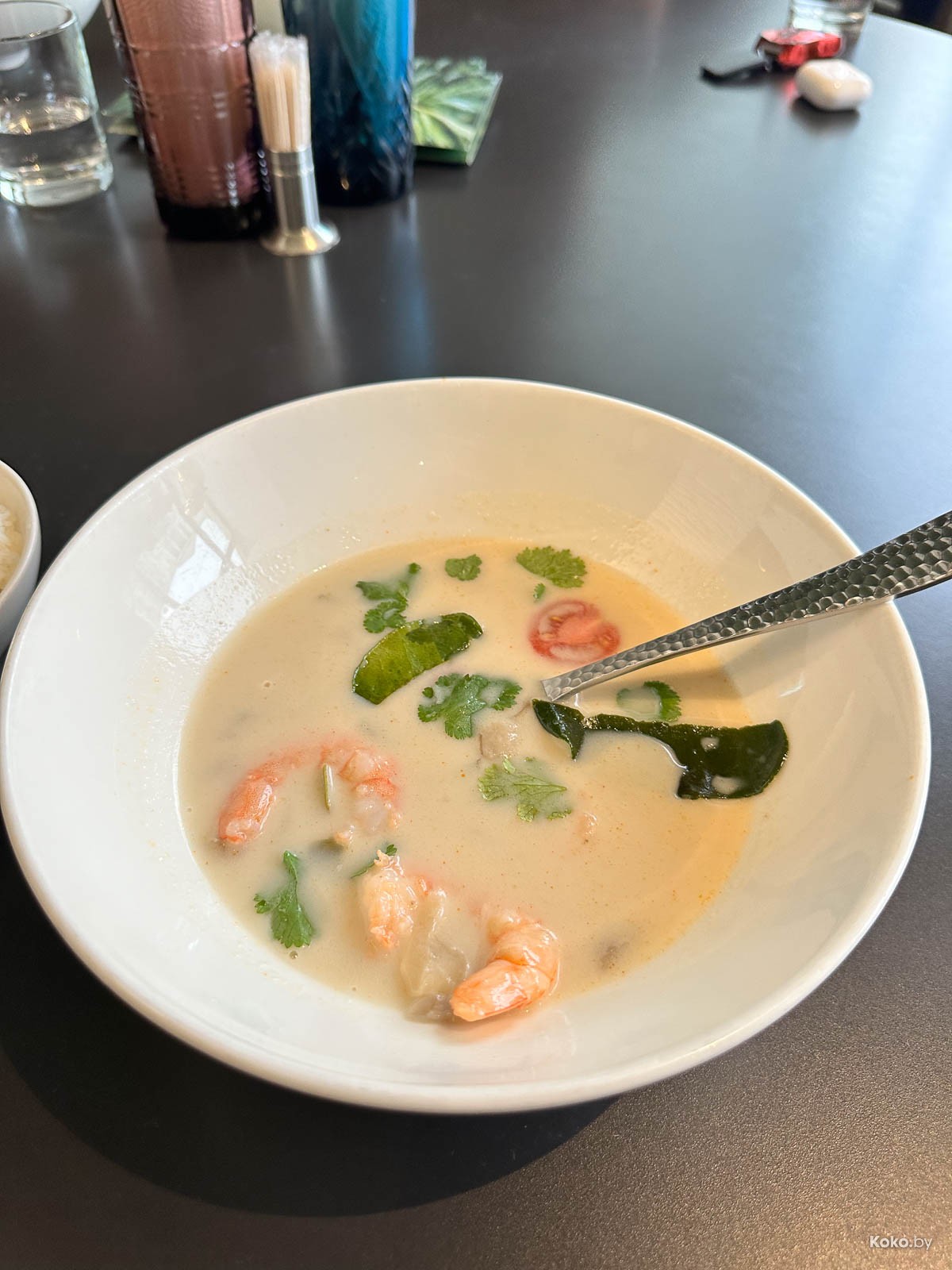 2. Сладковатая, кокосово-молочная похлёбка Том Кха за 10,50р лучше, чем у всех, потому что там, как и положено, много сладкого лука, грибов шиитаке и курицы. Вот он намного лучше, чем в «Тайском Саду».