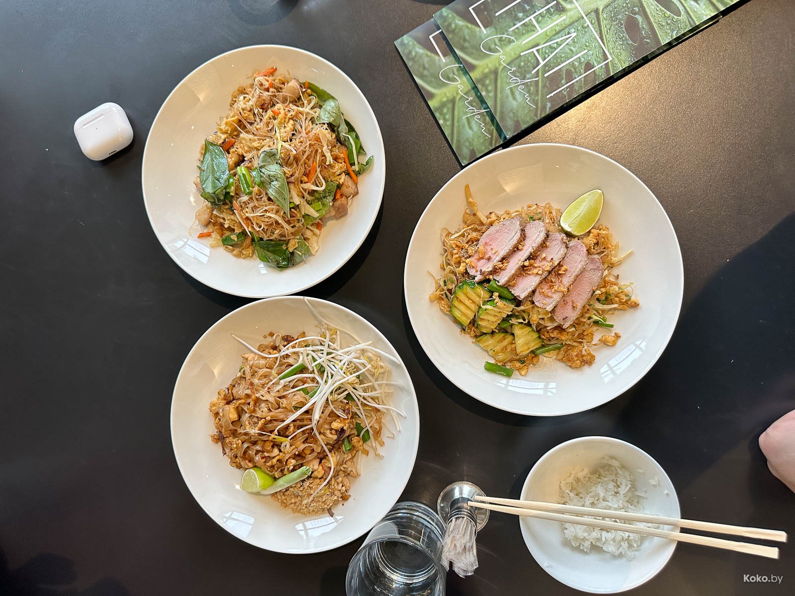 На крохотной кухне готовят ловко, два Том Яма с курицей, Том Кха с курицей и Пад Тай по коробочкам разложили за 46р и 16 минут.