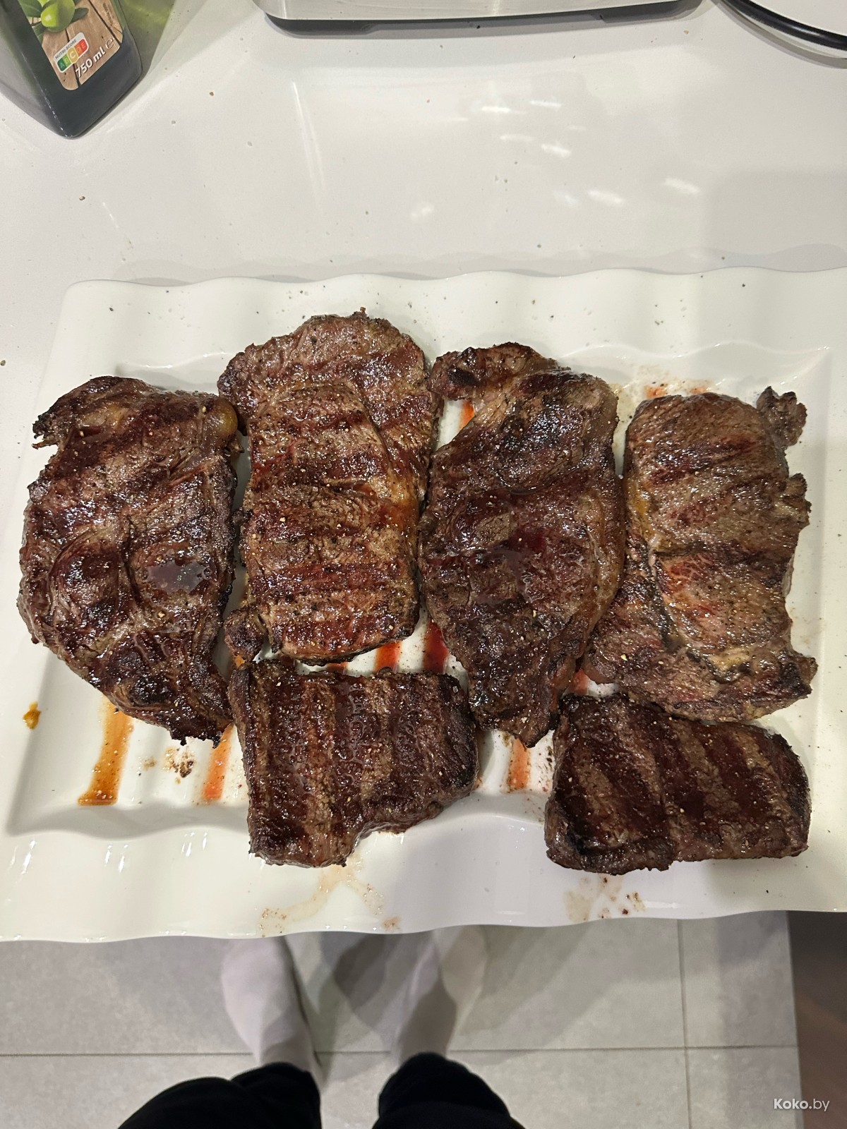 Насторожило, что стейк в форме сапога, Акела, выбиравший мясо, промахнулся! Я хз, что за мясо они закупили, но острым ножом его разрезать было сложно, стол под моими усилиями поесть ходил ходуном.