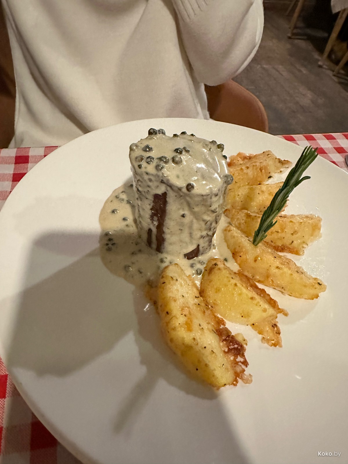 Из недавних, топовый стейк из белорусской вырезки в сливочном соусе из зелёного перца с картофелем конфи за 49р/350г в «Ла Скала».