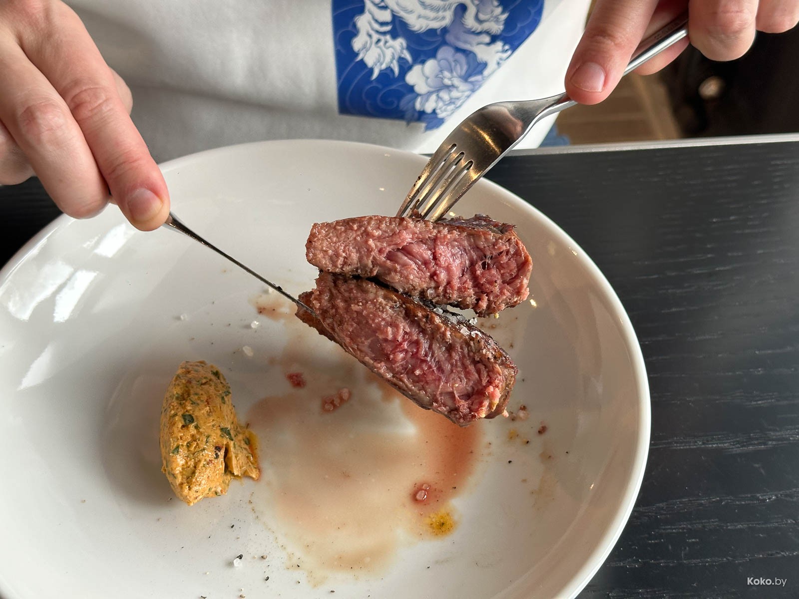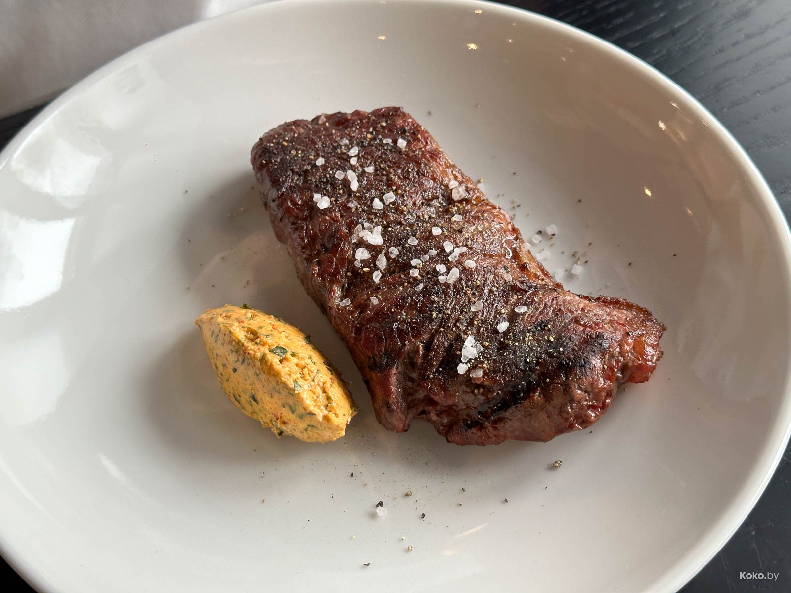 5. Держитесь за что-то устойчивое. В тарелке самое дорогое из меню, на что возлагал самые большие надежды - стейк Нью-Йорк из мяса «Праймбиф» за 85р без гарнира, но с пряным маслом.