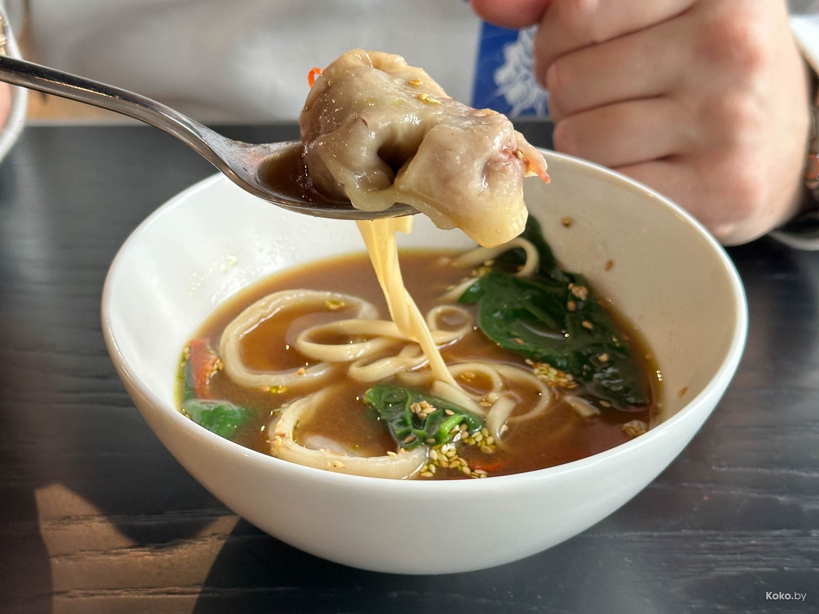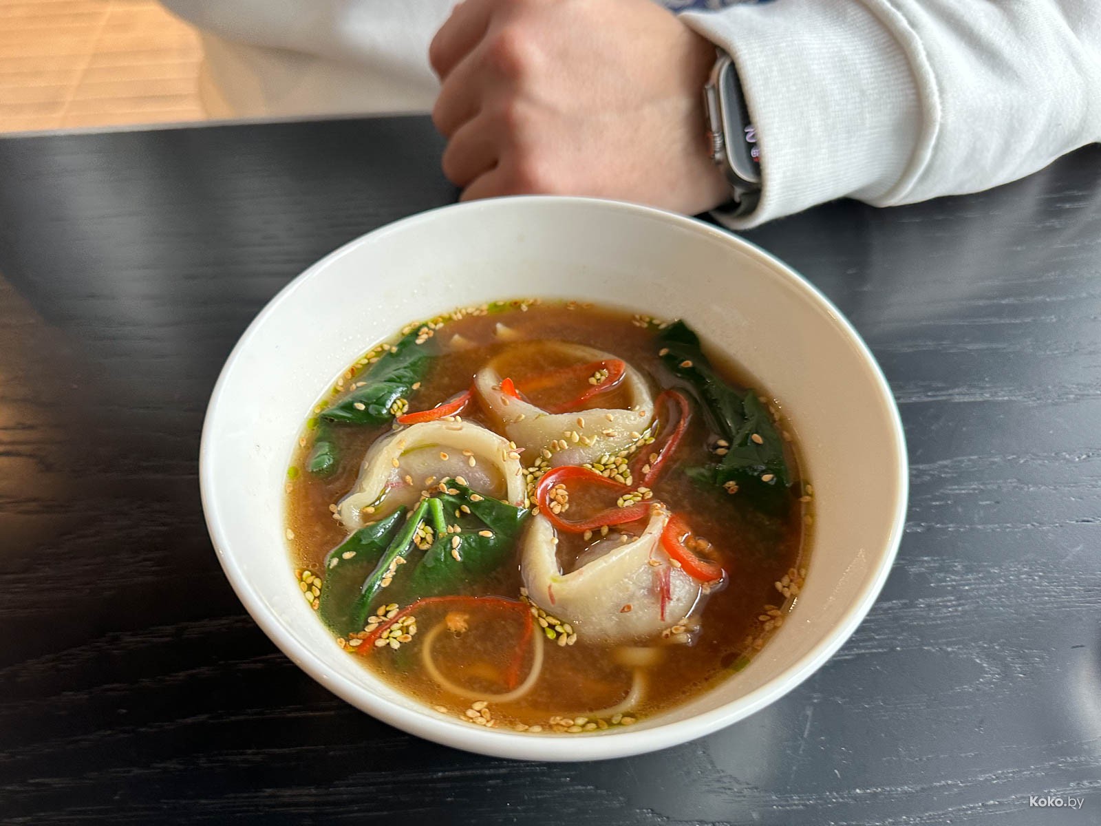 3. Рамен не рамен - говяжий суп с тремя большими пельменями, начинёнными нежным мясом со щеки коровы и магазинной лапшой. Бульон был хорош, зачем и макароны и пельмени? С вас 23р за суп.