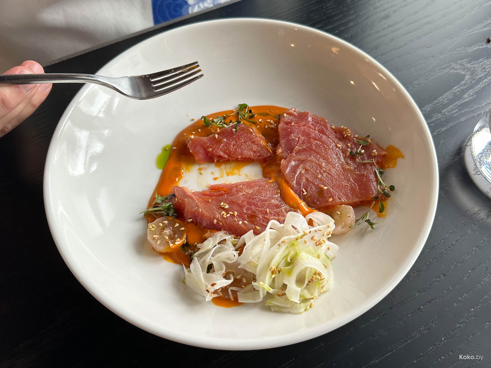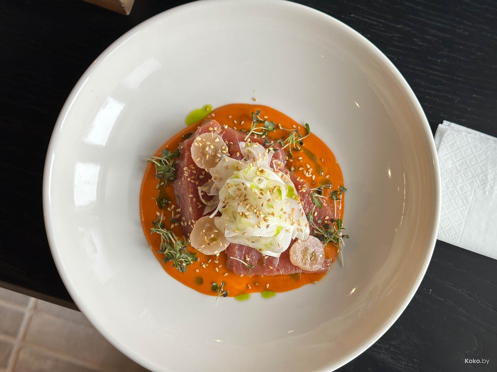 2. Из закусок сочный кусок тунца со сезонным фенхелем и освежёванным заживо виноградом на пюре из облепихи. Тунец был вкусным, остальное на любителя того, что лучше в чае. С вас 24р.