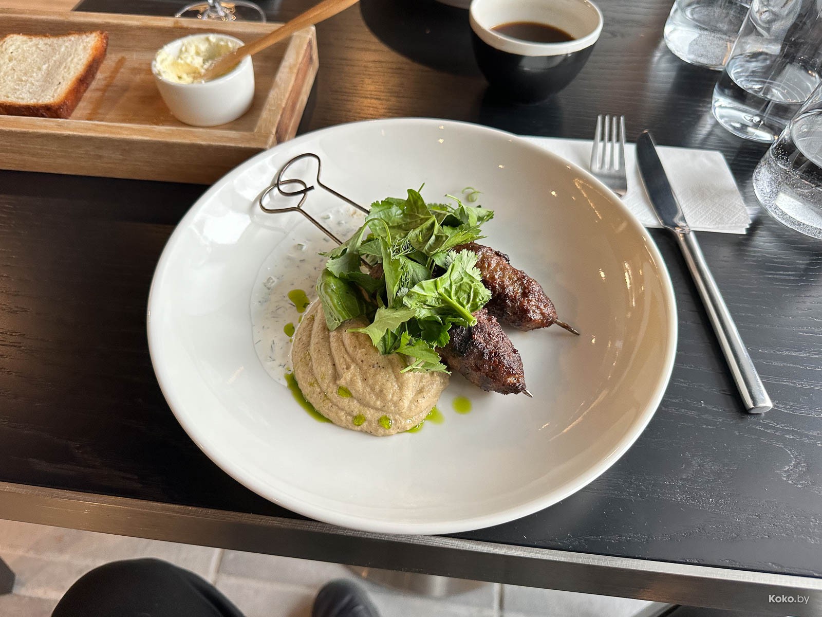 4. Два мясистых кебабчика из барашка на шампурах под разными травами с пюре из баклажанов и йогуртовым соусом дзадзики. Так красиво, что вкусно, мясо могло быть сочным. Годно, давайте сюда 32р.