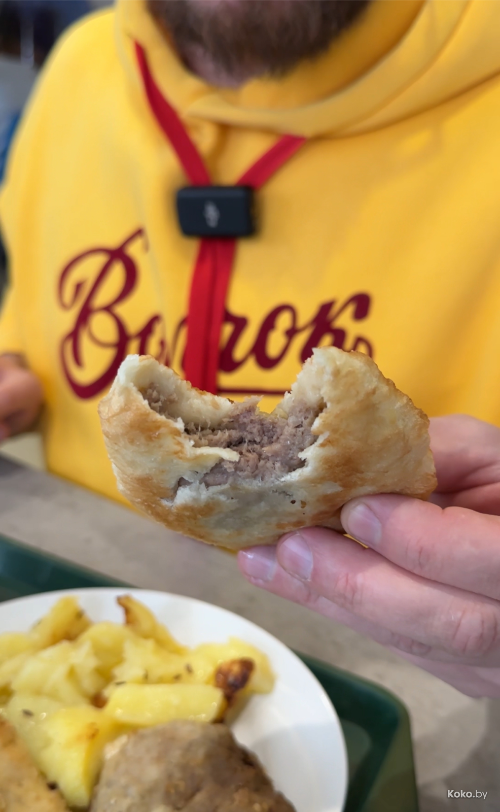 5. После казахского сериала 5:32 с опаской кусаю беляш за 1,12р. Плоский, тесто пышное, дрожжевое, мяса полторы столовых ложки. Хорош. Запил его заводским какао на фундучном молоке, шутка, на обычном. Еда залетала, как в мясорубку, не всё попало в кадр, смотрим видеообзор.