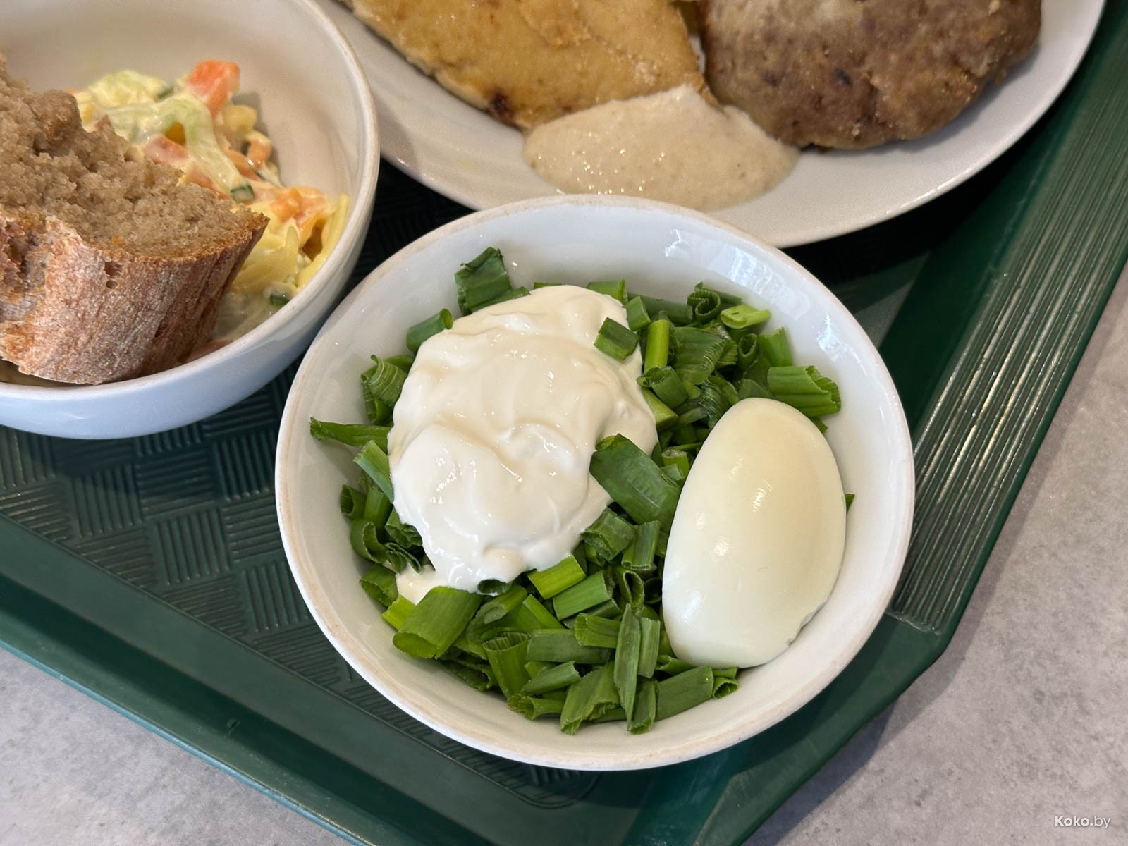6. Четверть отваренного яйца на тартаре из сезонного лука, заправленного жирной сметаной. Что-то на вегетарианском за 1,45р. Яйцо в себя, лук в борщ, и вуаля, у меня зимний холодник.