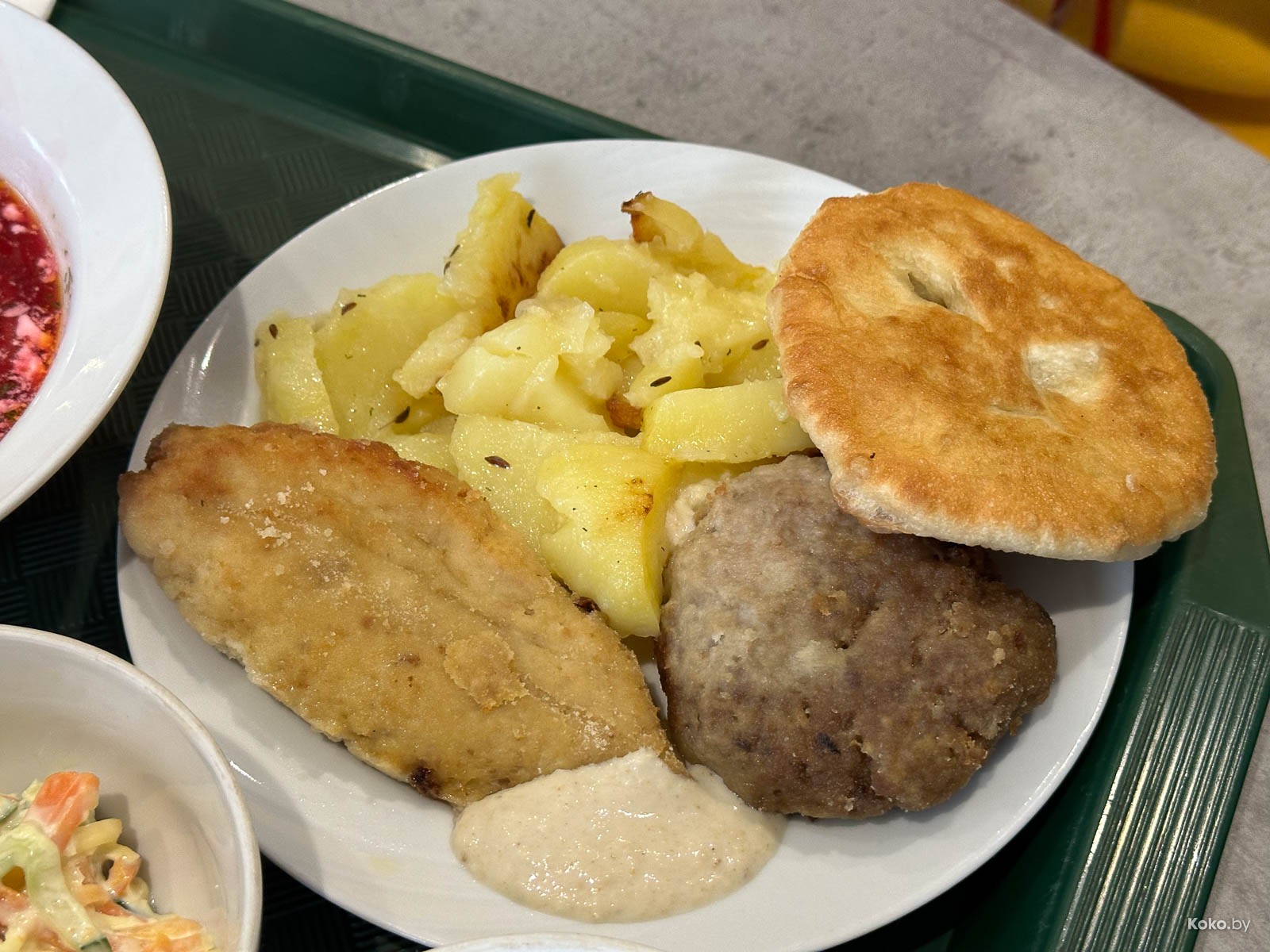 Голод не тётка, поэтому на поднос падают салат, закуска жареная картошка, шницель из рыбы, мясной биточек, под это дело соус из хрена, хлеб из печи, какао, компот из шиповника и на десерт беляш от шефа.